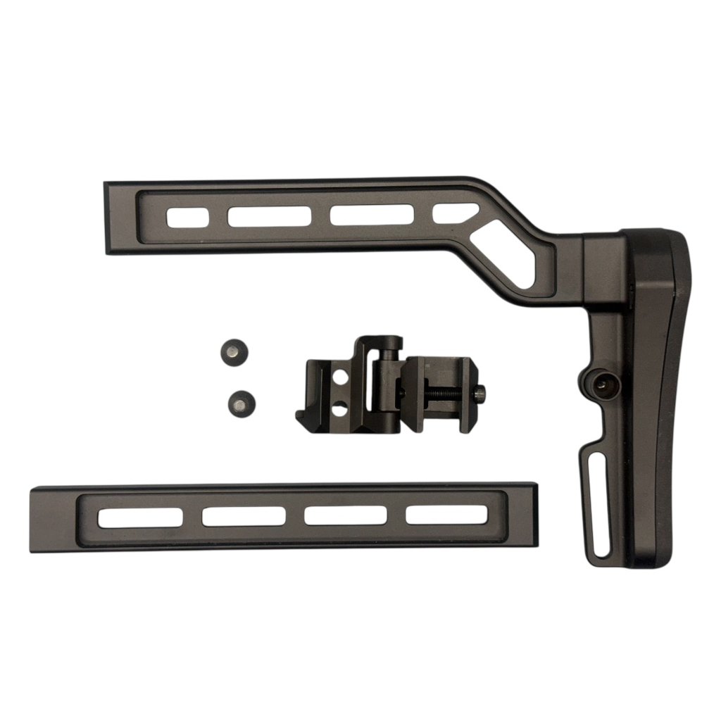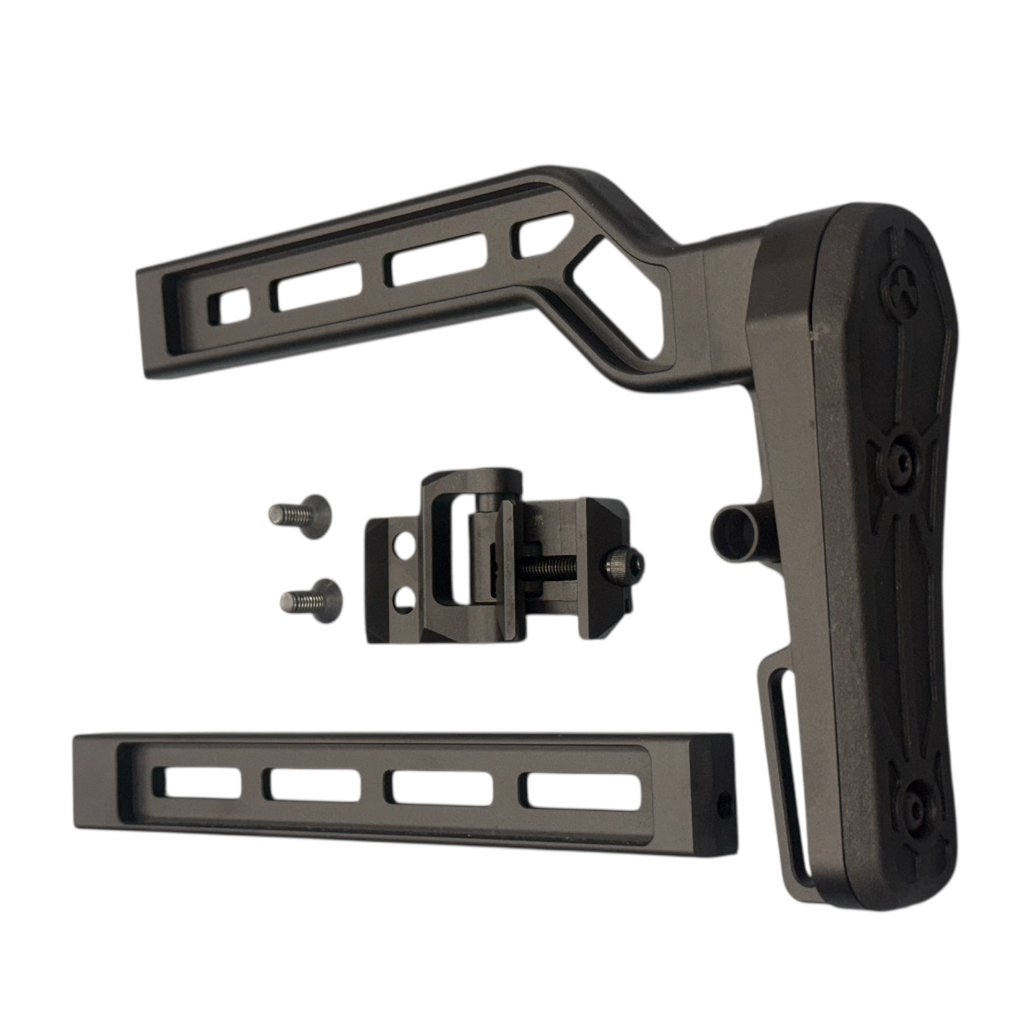 Součástí je dvojité rameno se zvýšenou a úhlovou pryžovou ramenní opěrkou ve stylu MGP, která poskytuje pevný a pohodlný opěrný bod. Zadní QD slot umožňuje rychlé připnutí nebo odepnutí popruhu. Pažba je dodávána kompletně s upevňovacím šroubem a celková délka činí 200 mm.