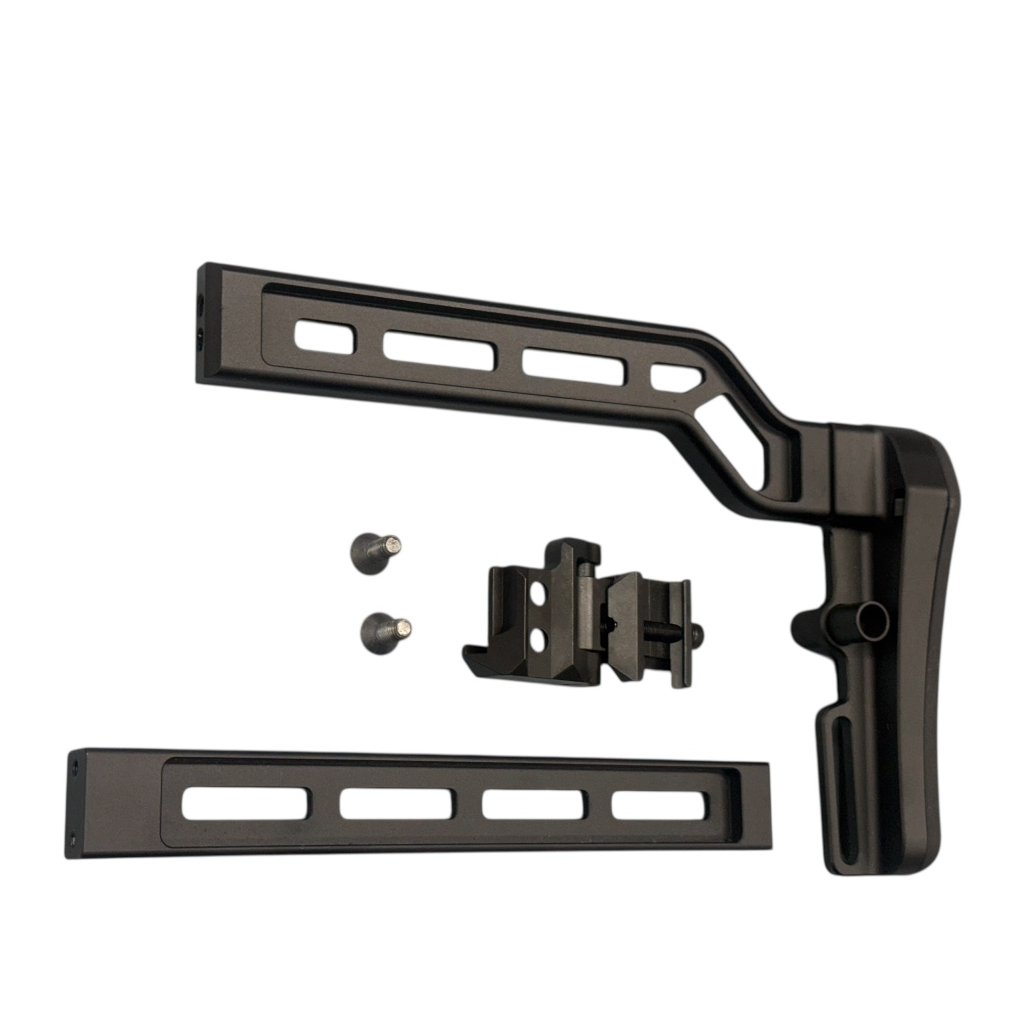5KU Modulární sklopná pažba pro RIS montáž-černá je určena pro uživatele, kteří požadují vysokou odolnost, stabilitu a možnost rychlé změny konfigurace. Pažba je vyrobena z pevného kovu a vybavena sklopnou destičkou kompatibilní s 20mm Picatinny adaptéry, což umožňuje její použití na široké škále airsoftových i taktických platforem.