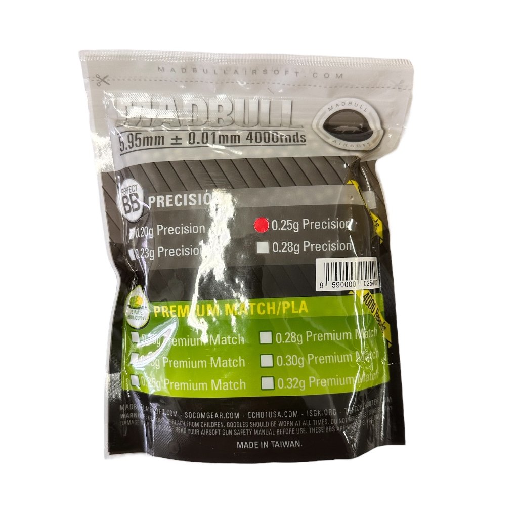 BB MADBULL Precision 0.25g/4000 kuličky vhodné pro airsoftové plynové nebo elektrické zbraně.