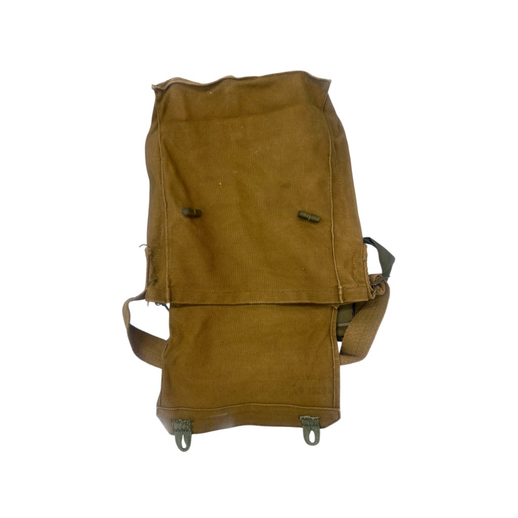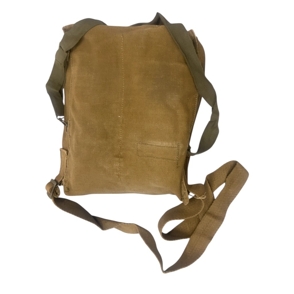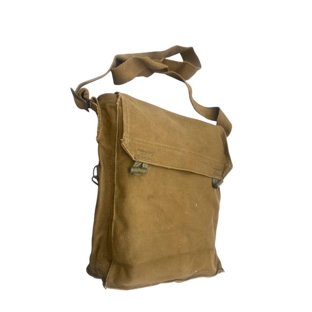 Brašna BSS na plynovou masku somradlo s kolíky ČSLA originál - Tato originální brašna Československé lidové armády (ČSLA) byla vyrobena v 50.–60. letech 20. století z pevného bavlněného plátna. Sloužila k přenášení plynové masky a dalších drobných doplňků. Brašna má nastavitelný látkový popruh přes rameno a možnost fixace kolem pasu, praktické zapínání na dva dřevěné kolíky a tři úložné komory – jedna větší a dvě menší, včetně přihrádky určené k uložení mýdla na zorníky.