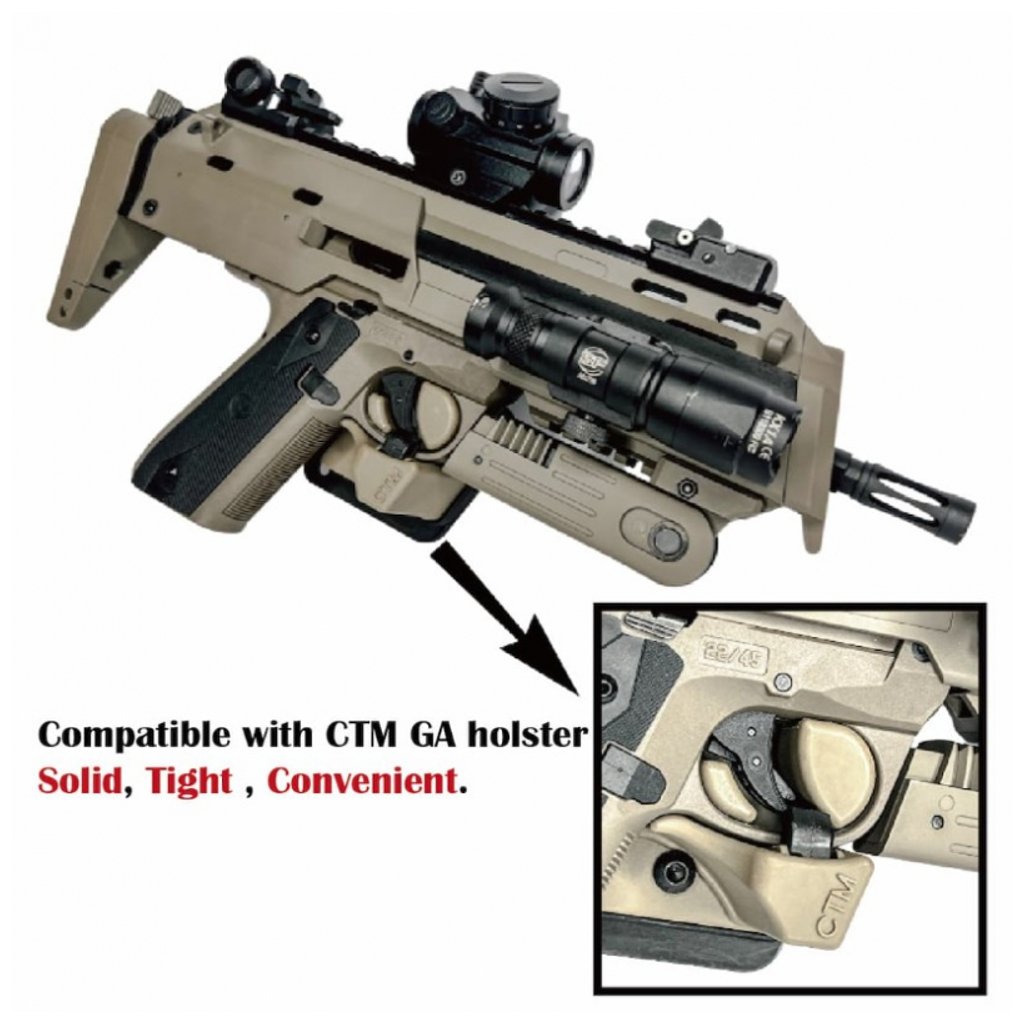 Popis produktu: Tento konverzní kit je navržen pro plynové pistole Action Army AAP-01 a umožňuje jejich transformaci na repliku samopalu (PDW) MP7. Kit je dostupný v několika barevných variantách a obsahuje výsuvnou pažbu se třemi nastavitelnými pozicemi. Ramena pažby jsou vyrobena z nylonových skleněných vláken, což zajišťuje vysokou pevnost a odolnost. Přední část je vybavena sklopnou ručkou, která je odnímatelná díky upevnění na RIS liště. Kit je dále vybaven vrchní a bočními RIS lištami, které umožňují přizpůsobení repliky přidáním doplňků jako svítilna, kolimátor nebo PEQ box. Replika je kompatibilní s pouzdrem / holsterem od CTM TAC. Podrobný návod na instalaci kitu na AAP-01 je k dispozici ve formě videa.