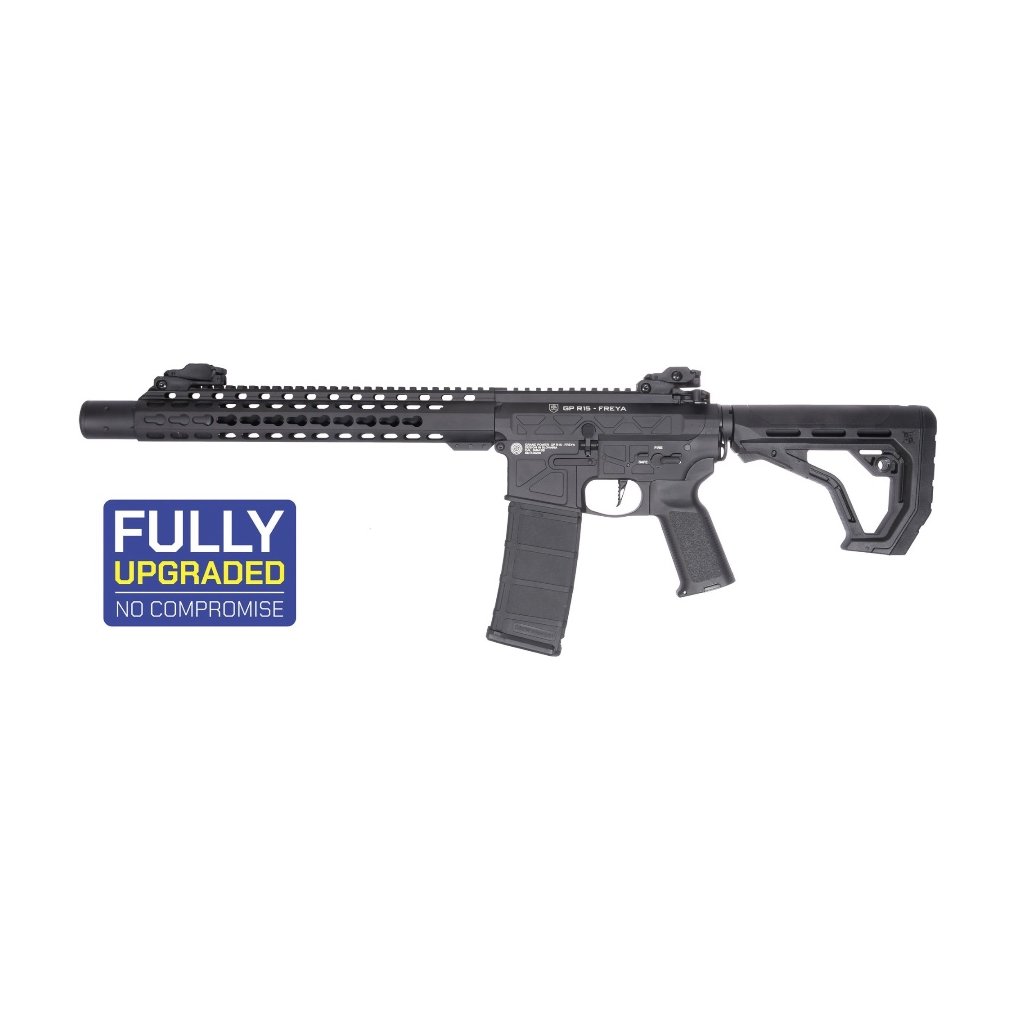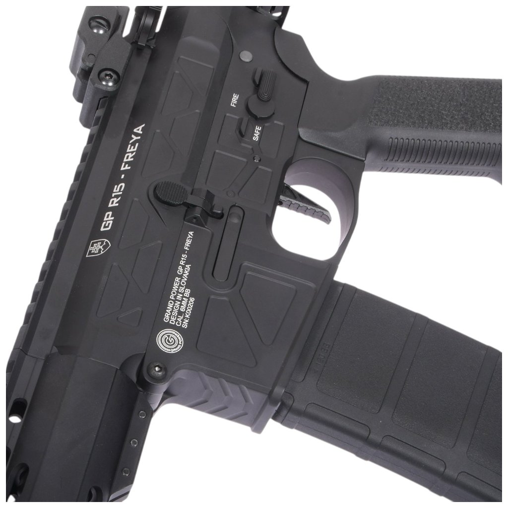 Druhá generace FREYA R15 SilentOps DMR v černém provedení přináší Full Upgrade - No Compromise s CNC vnitřními díly, precizní hlavní 6,03 mm, výkonným motorem s vysokým točivým momentem a integrovaným pěnovým tlumičem 110 mm. Celokovová konstrukce, KEYMOD předpažbí 12,2 palce (31 cm), moderní pažba Delta Stock v.2, nejnovější opticko-magnetická procesorová jednotka Eagle ETU a široké možnosti nastavení dělají z této airsoftové repliky špičkovou volbu pro DMR role i standardní mise. Připravená pro 11,1V LiPo s konektorem Deans-T, licencovaná Grandpower