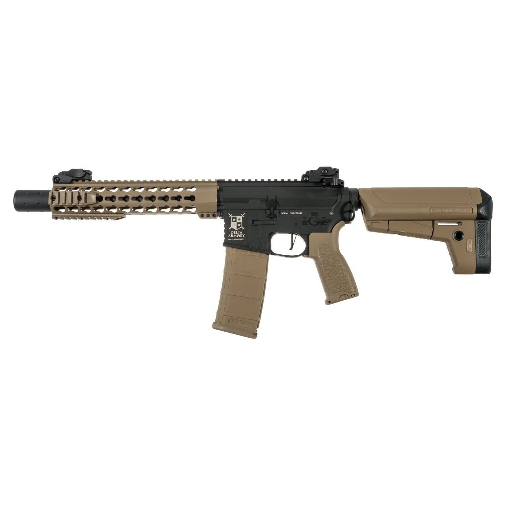Delta Armory M4 AR15 KeyMod 10" PREDATOR Charlie Half-Tan je elektrická airsoftová zbraň s lehkým polymerovým tělem a integrovaným 10 palcovým KeyMod systémem pro snadnou montáž příslušenství.