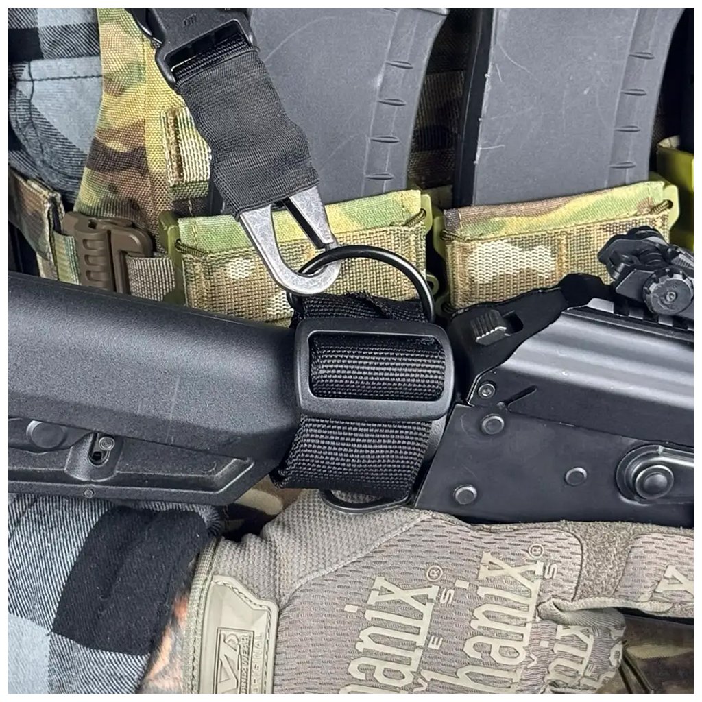 je pevné a praktické řešení pro používání jednopunktových popruhů u zbraní, které nemají standardní ucho pro jejich uchycení, nebo je ucho umístěno na hraně pažby, což ztěžuje připojení. Tento adaptér používá odolnou nylonovou pásku se zesílením a acetalovou dvousmyčkovou přezkou pro spolehlivé uchycení. Integrovaný kovový polokroužek slouží jako nové ucho — umožňuje snadné a bezpečné připevnění QD karabiny nebo háku popruhu. Délka a šířka pásky zajišťují pevné usazení na zúžení pažby a konstrukce je navržena tak, aby vydržela opakované nasazování i náročné terénní použití.