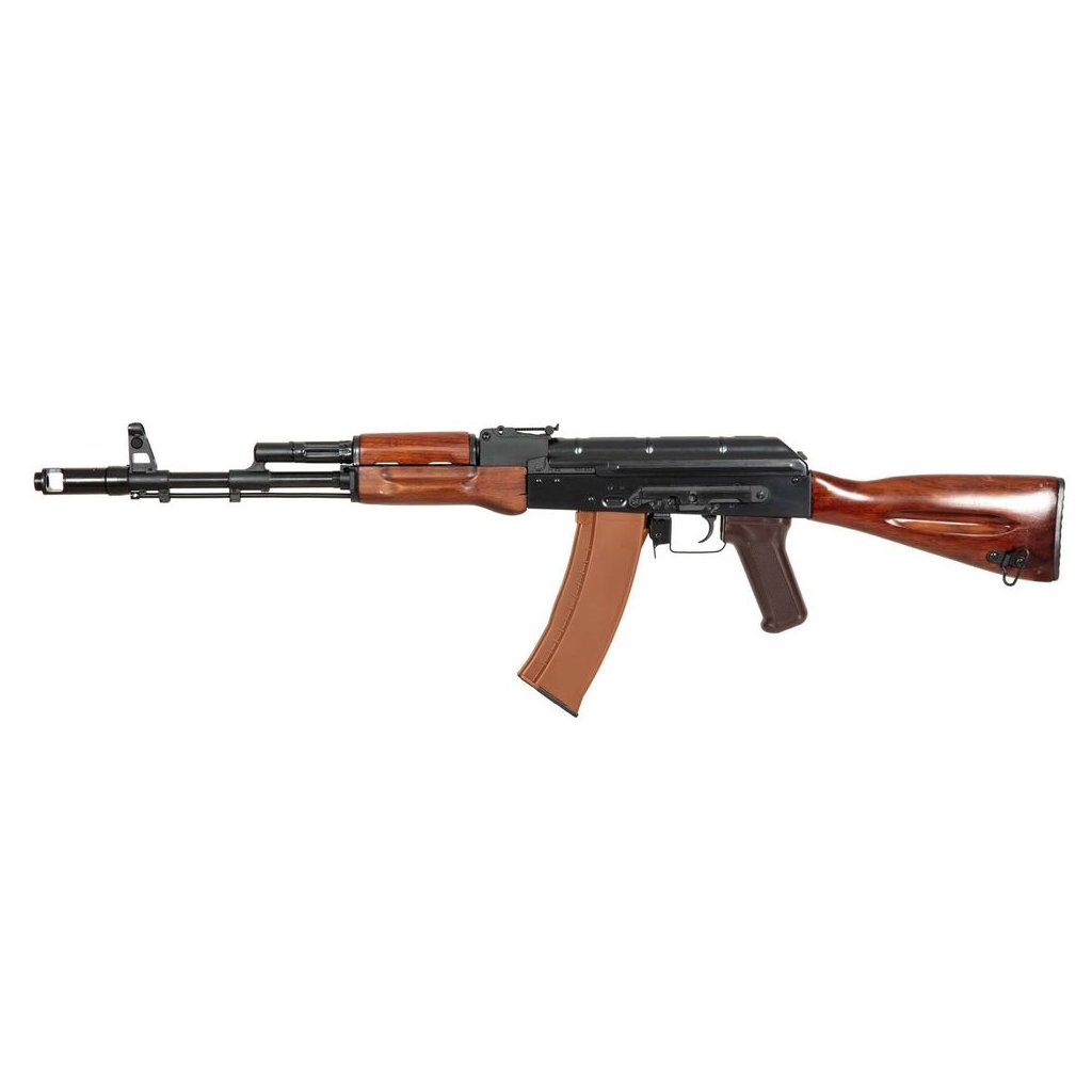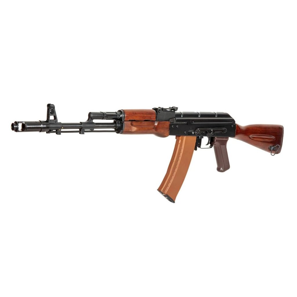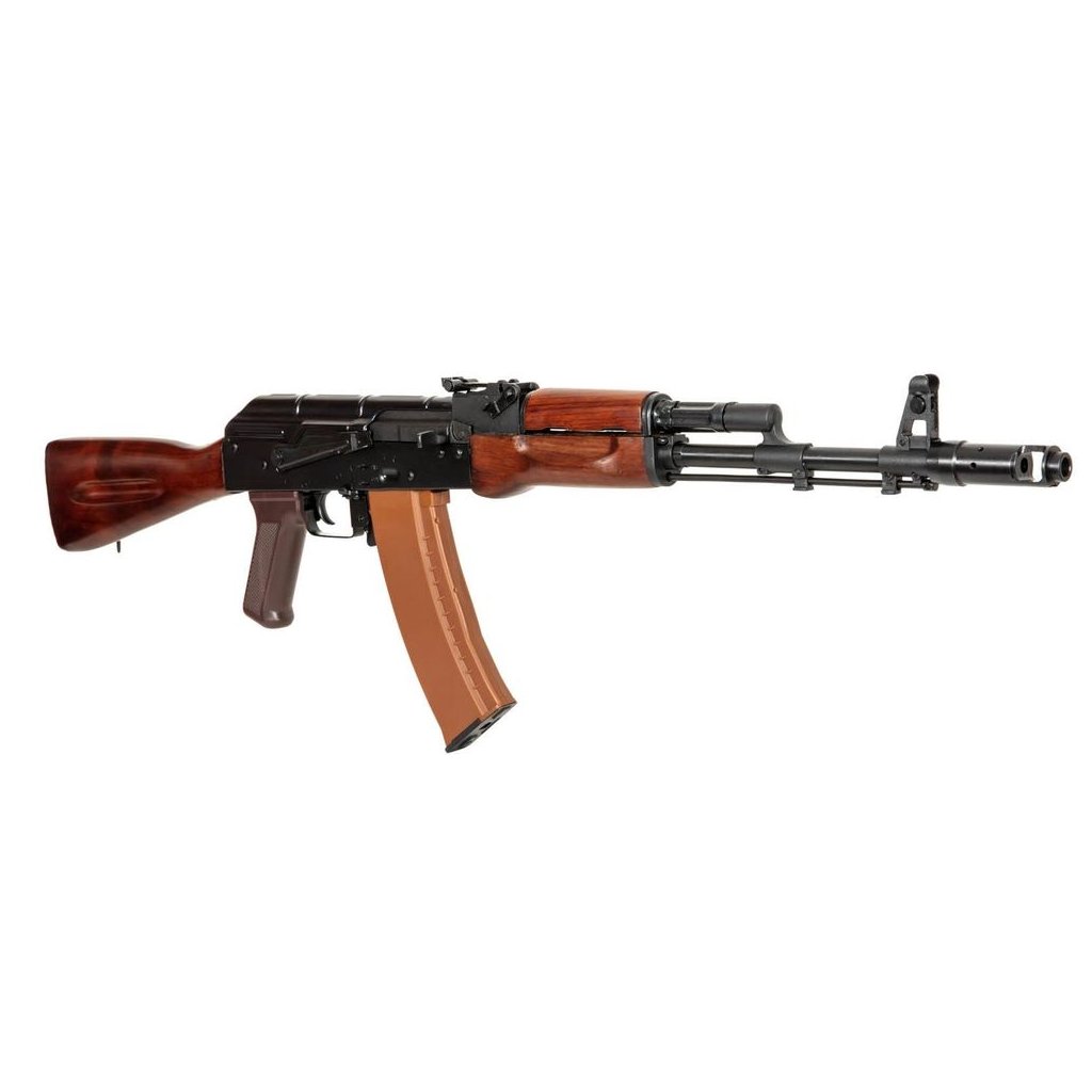 Výborná a věrohodná replika sovětské pušky AK74 z dílen E&L. Co zaručuje autentický pocit, je skutečnost, že airsoftové repliky od E&L jsou montovány v továrně, kde se vyrábějí skutečné střelné zbraně, což znamená, že některé vnější prvky jsou shodné s originálním protějškem a pocházejí ze stejné výrobní linky. Replika je vyroba výhradně z oceli, s realistickým vzhledem a konstrukcí, kovovým mechaboxem. Pažba a předpažbí jsou vyrobené z lakovaného dřeva.