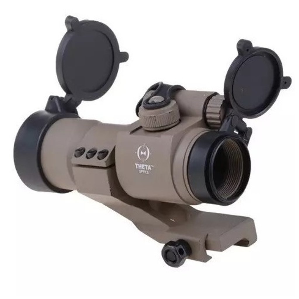 The Battle 1x30 collimator from Theta Optics™ is a robust reflex sight with a durable metal housing, designed for combat applications. It offers a red and green aiming point with smooth adjustment and multiple brightness levels, powered by three AG13 batteries. The mount is compatible with a standard 22mm RIS rail for quick and accurate aiming.