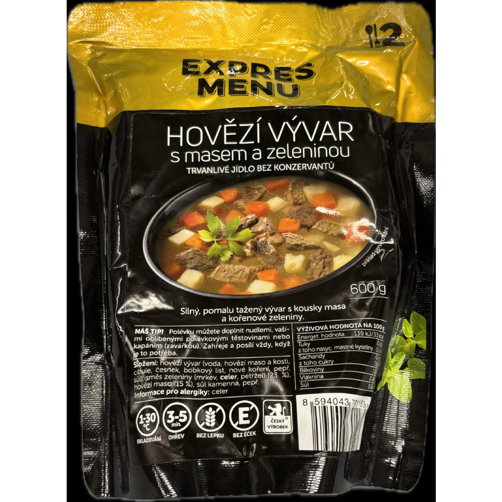 Hovězí vývar s masem a zeleninou 600 g (2 porce) – Expres Menu je silný, pomalu tažený vývar připravený z kvalitních surovin s důrazem na plnou chuť a výživovou hodnotu. Obsahuje kousky masa a kořenovou zeleninu, které dodávají polévce tradiční charakter. Pokrm je vhodný pro rychlou přípravu v domácích podmínkách i v terénu. Lze jej podávat samostatně nebo doplnit nudlemi, polévkovými těstovinami či zavářkou podle preferencí. Praktické balení umožňuje snadné skladování i transport.