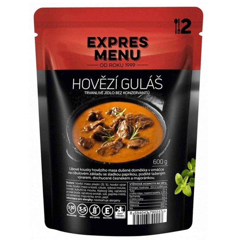 beef forequarter (31%), beef broth (water, beef and bones), onion, rice flour, garlic, corn flour, rapeseed oil, tomato paste (water, tomato paste, salt), ground paprika, rock salt, marjoram, cumin, pepper.