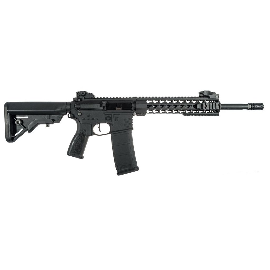 Delta Armory brings a new generation of AR15 rifles. The AR15 Keymod Charlie 10" ETU is a high-quality airsoft replica made of durable Nylon polymer with carbon fiber, which makes the weapon light yet durable. Thanks to the upper 22mm RIS rails, a wide range of accessories, such as collimators or rifle scopes, can be added to the fore-end of the weapon. The sides of the handguard are adapted for Keymod mounting. The outer barrel is made of metal and finished with a 14mm left-hand thread and fitted with a silencer. The improved stock design allows for the use of larger batteries. The design of the weapon allows for quick replacement of the spring and motor. The durable gearbox is capable of operating with springs of 120 to 130 force. When using stronger springs, some parts wear out faster.