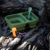 Foldable lunchbox is made of durable silicone. It’s flexible, portable, and easy to clean. Ideal for traveling, camping, or other outdoor activities. Plastic lid with integrated fork/spoon compartment. Can be used in the microwave. Be careful when using hot liquids.
