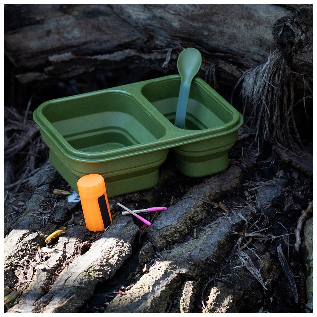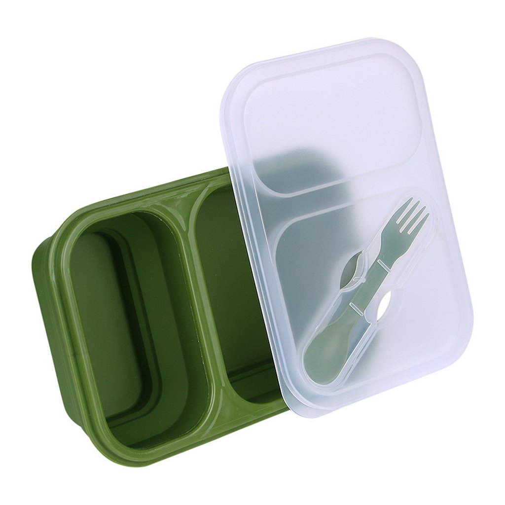 Foldable lunchbox is made of durable silicone. It’s flexible, portable, and easy to clean. Ideal for traveling, camping, or other outdoor activities. Plastic lid with integrated fork/spoon compartment. Can be used in the microwave. Be careful when using hot liquids.