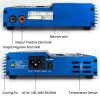 Technical features include microprocessor control and a backlit LCD display for easy operation. The charger supports functions such as Delta-Peak charging, LiPo and LiFe A123 charging, and Ni-Cd and Ni-MH charging. It allows a wide range of charging currents, a parking function for Li-Pol batteries, a time limiter, and power monitoring. The built-in memory allows you to store up to five charging packages, and the device supports battery formation and temperature sensor connection.