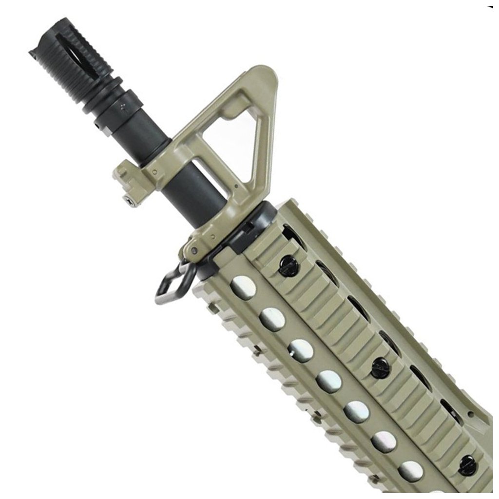 Its short CQB length combined with R.I.S. rails allows easy handling in buildings and straightforward mounting of accessories such as flashlights, red dot sights, or foregrips. Internally, the replica features a metal Version 2 gearbox with steel gears and a polymer piston, along with an adjustable hop-up system using a polymer chamber. The rifle is compatible with standard M4/M16 AEG magazines and is powered by a Li-Pol battery stored in the stock. The CM.505 is a solid choice for recreational play and first-time airsoft users.
