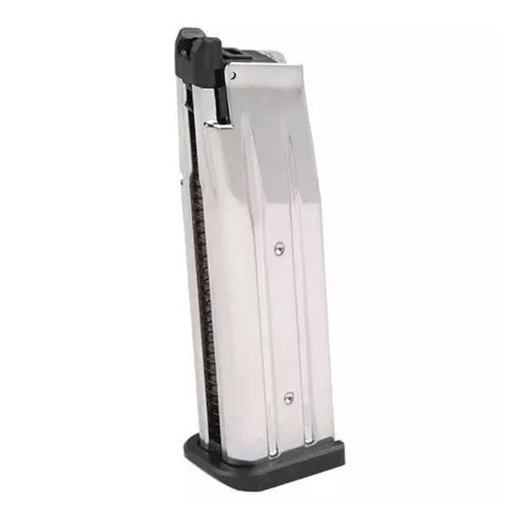 Magazine for the Hi-Capa 5.1 gas gun from Tokyo Marui. It is made of chrome-plated metal and has a capacity of 31 rounds.