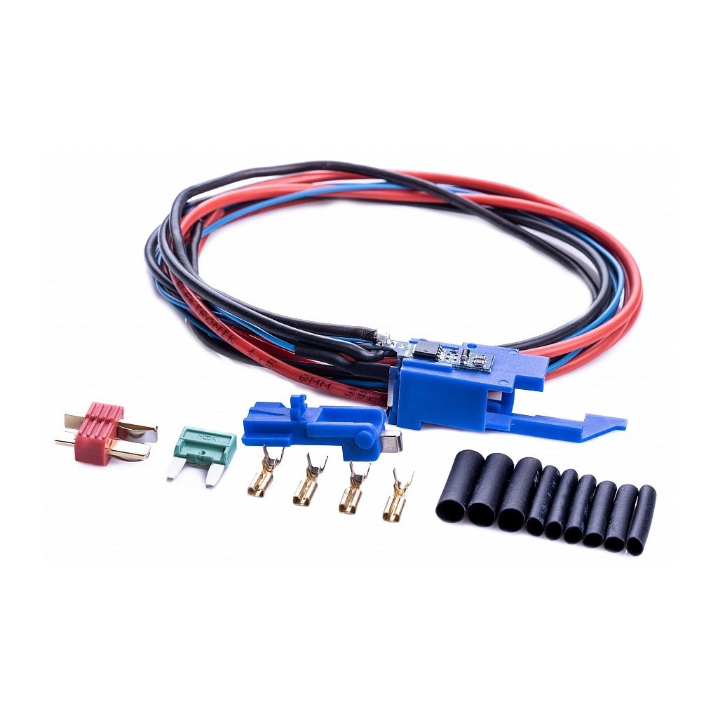 SPECIFICATIONS: - Built-in mosfet on switching contacts from SHS - Easy installation inside the v.3 mechbox - Pre-prepared wiring allows for faster and easier installation in the weapon and is long enough for all types of weapons. Simply shorten the wires to the required length and connect the connectors (included in the package) - The device has 2 black wires with MPPE insulation with a cross-section of 1.5 mm², length 400 mm to the motor and 600 mm to the battery, and a blue wire with a cross-section of 0.34 mm² with a length of 1000 mm for connection anywhere to the red wire - The package also includes a 1000 mm long red wire with MPPE insulation, 1.5 mm2 cross-section - The electronics board is covered with a varnish that protects against water ingress into the device - If you want to use your own wires, choose the version without cabling - Designed for springs up to m160 (corresponds to a current of 75A for a single shot or 25A for burst fire for a maximum of 30 seconds). For higher loads, choose Mosfet II (placed outside the gearbox) - Designed for all types of commonly used batteries up to 17 V (Ni-xx 8.4 - 12V, lipol 7.4 - 14.8V) - Trigger contacts do not burn out - No current is drawn in idle state - Due to the principle of operation of the AEG weapon mechanism, the piston stops in a random position in AUTO mode - For this device to function properly, the gearbox must have a functional interrupter, switch slide, reverse latch, trigger, and trigger stop (secured), i.e., as in a standard gearbox PACKAGING: - MOSFET on switching contacts with powered wires - Trigger boat - DeanT male connector - 30A mini plug fuse - 4x faston sleeve - 6x black heat shrink tubing 3.2mm, length 20mm - 3x black heat shrink tubing 4.8mm, length 20mm - installation manual WARNING: The installation of this device requires a professional who knows how to solder and disassemble an AEG weapon. Never use a transformer soldering iron! Despite our best efforts, we cannot guarantee 100% compatibility of the device with all version 3 gearboxes. For most commonly available and widely used brands, the Mosfet - V3 can be installed without major modifications.