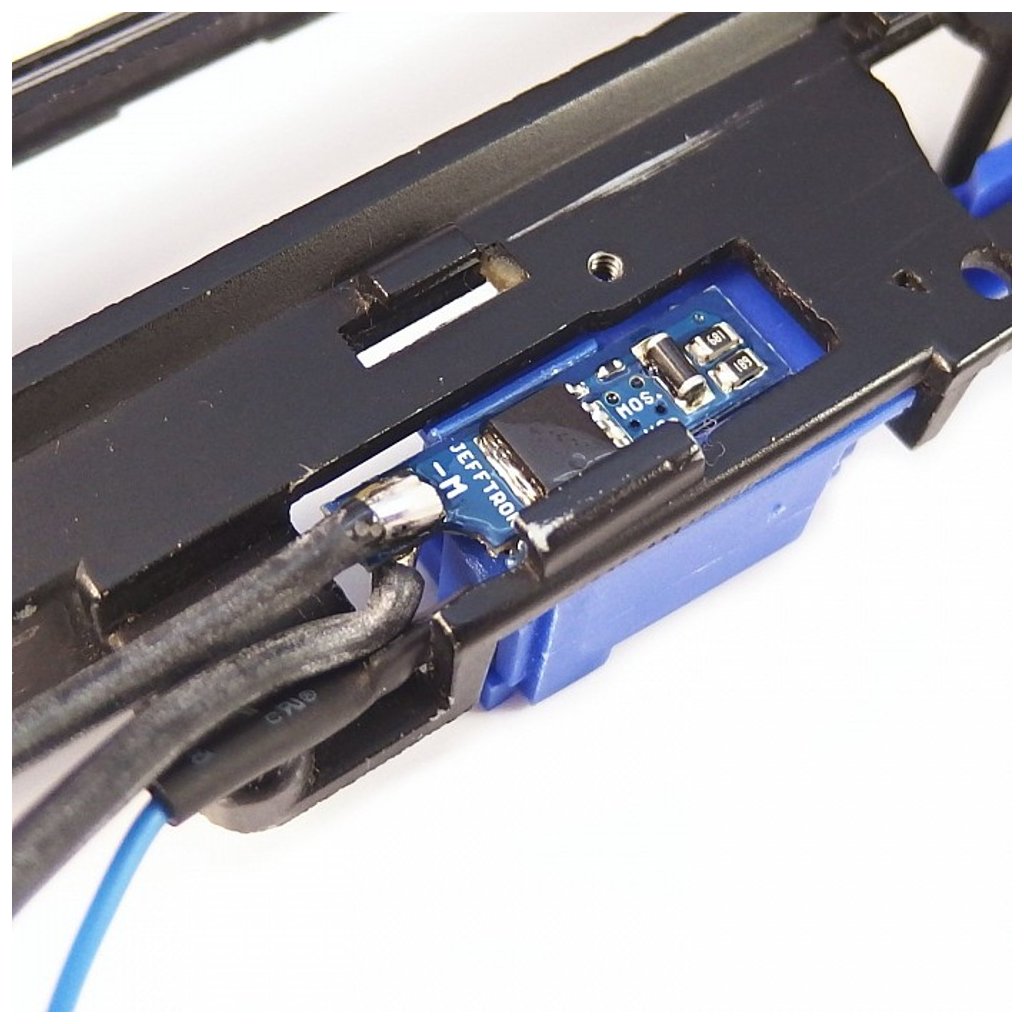 Professionally designed mosfet for airsoft electric guns. The device increases the rate of fire and battery life compared to the original wiring in the gun.