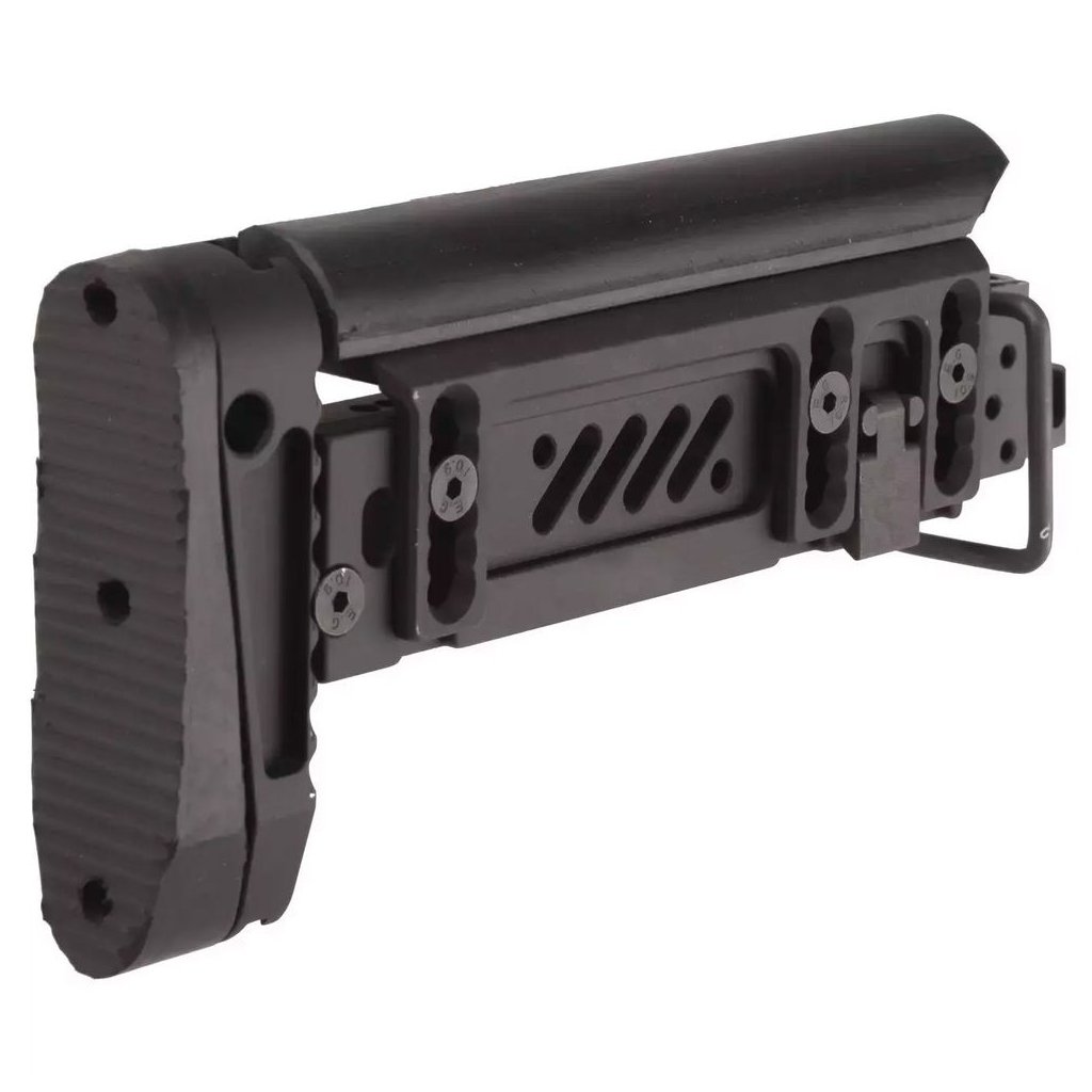 The PT-1 stock for AK-type weapons (Cyma / LCT / GHK) is made of durable and lightweight aluminum, while the locking lever and carrying handle are made of steel. This stock closely mimics the Russian original designed for firearms and improves the functionality and aesthetics of the classic AK rifle design in line with current trends in the Russian Federation's armed forces and among civilian users. The stock offers smooth length adjustment and is finished with a comfortable hard rubber butt plate. The adjustable cheek piece is made of rubber. This stock model is compatible with AK weapons with folding stocks, such as the AKS-74 or AK74M models.