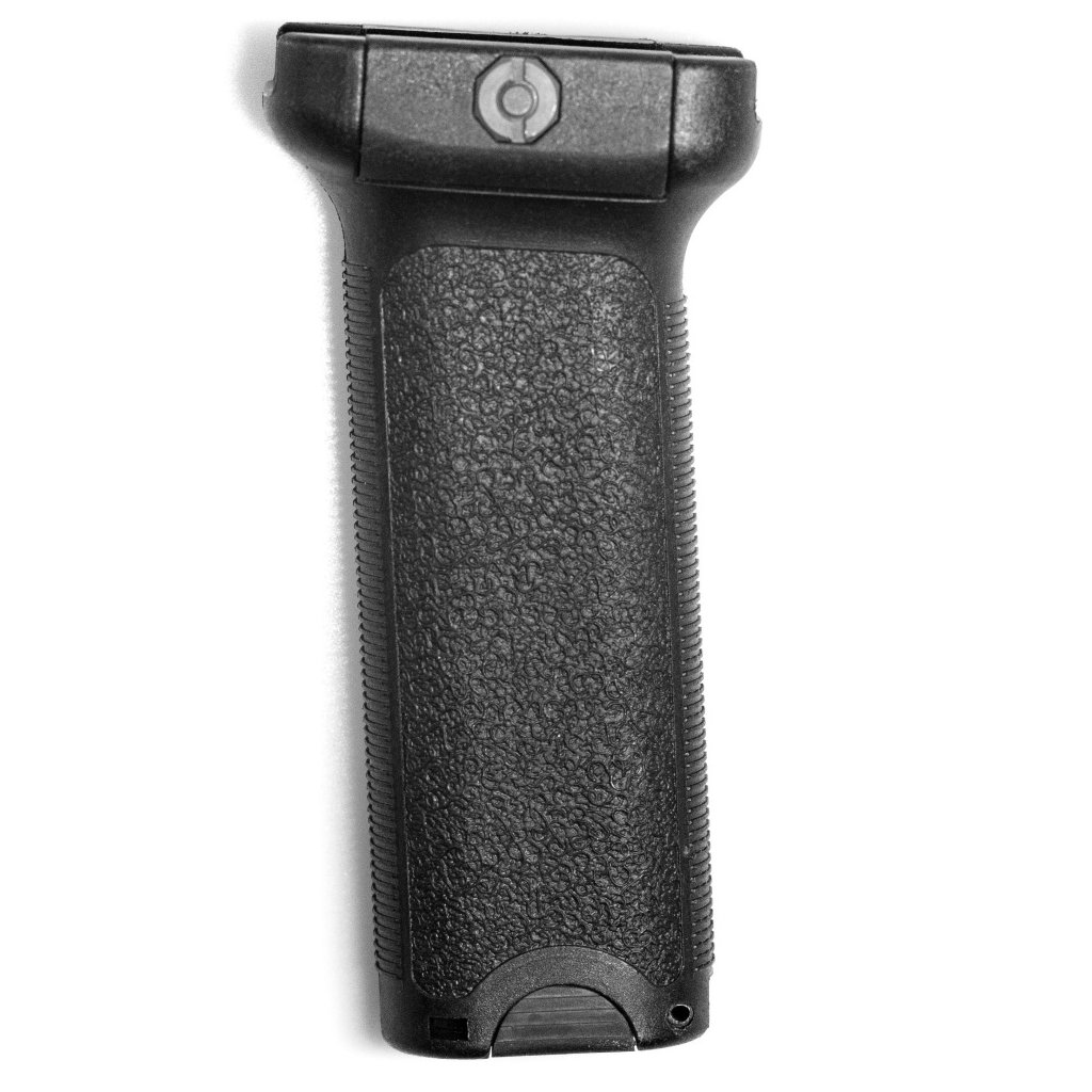 Technical description: The tactical vertical grip is designed as an ergonomic accessory for the fore-end of the weapon, optimizing the grip for better stability and control. The grip is tilted at an angle of approximately 20 degrees, providing a more natural and secure grip compared to traditional grips. The construction is made of durable polymer, ensuring long life and reliability in demanding conditions. It is compatible with standard 20mm RIS rails and is secured with a screw. The handle contains an internal storage compartment, accessible by flipping up the bottom, which is ideal for storing two CR123A replacement batteries.