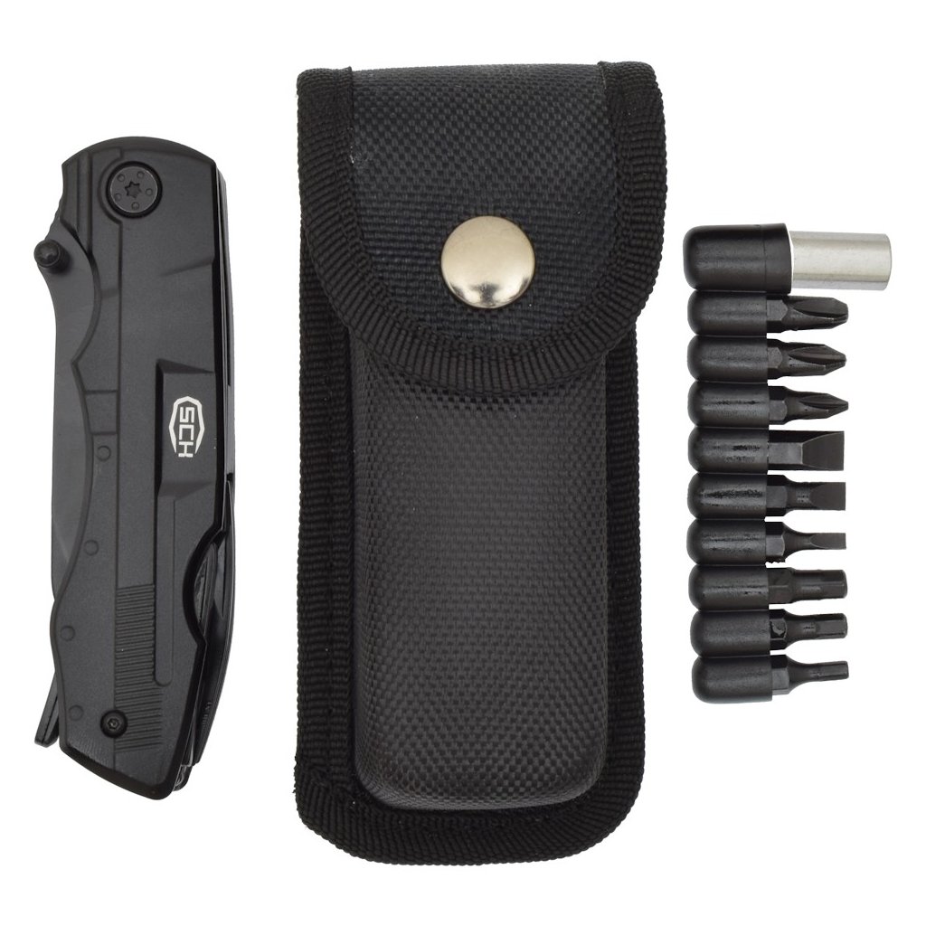 SCK multi-tool Pliers 5-in-1 (bit kits) is a practical and durable multifunctional tool with five functions that you will appreciate in everyday use and outdoor activities. It includes pliers, a knife with a liner lock and an easy-open hole, a corkscrew, a seatbelt cutter, and a universal screwdriver with nine bits (three Phillips, three flat, three hex). The package includes a Cordura case.