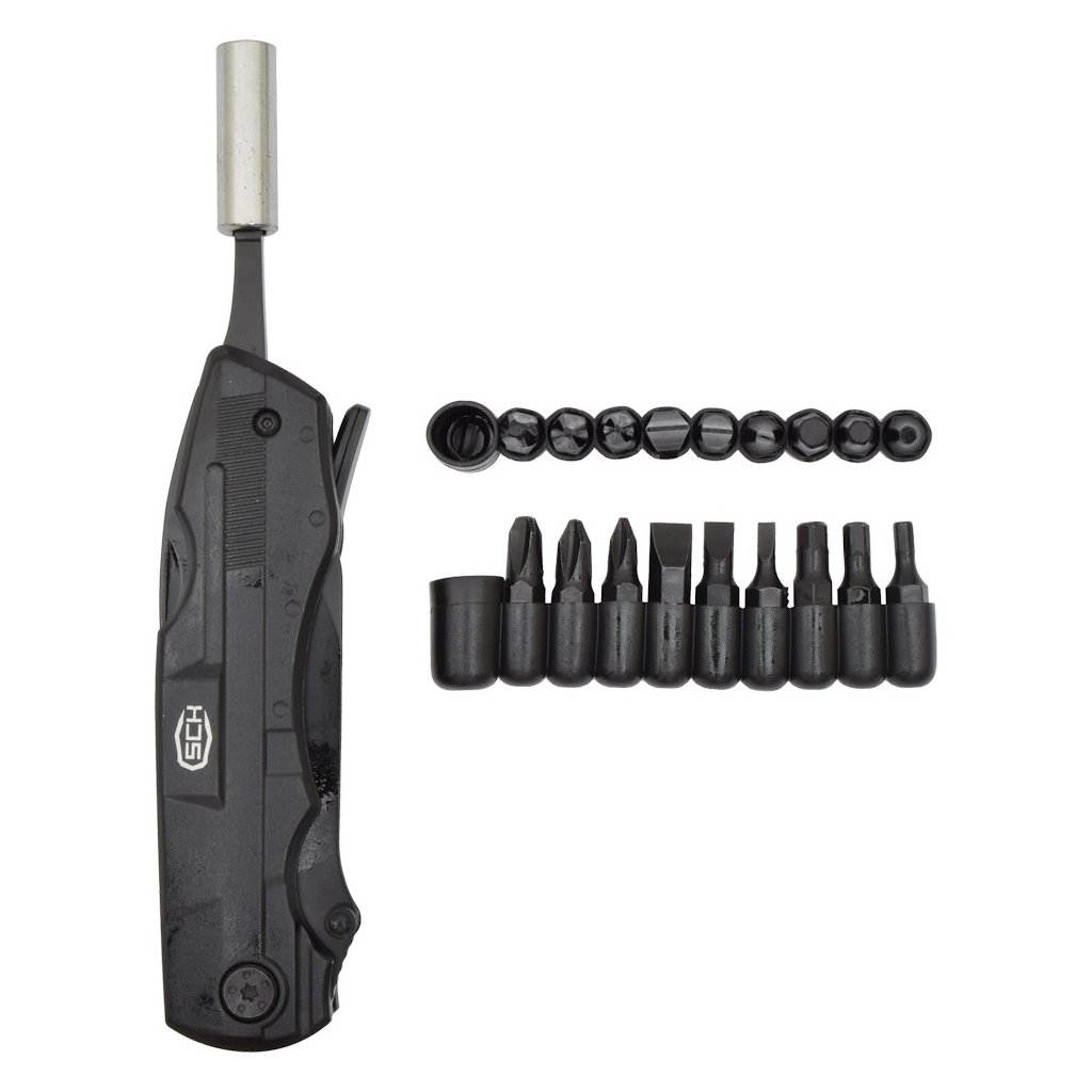 SCK multi-tool Pliers 5-in-1 (bit kits) is a practical and durable multifunctional tool with five functions that you will appreciate in everyday use and outdoor activities. It includes pliers, a knife with a liner lock and an easy-open hole, a corkscrew, a seatbelt cutter, and a universal screwdriver with nine bits (three Phillips, three flat, three hex). The package includes a Cordura case.