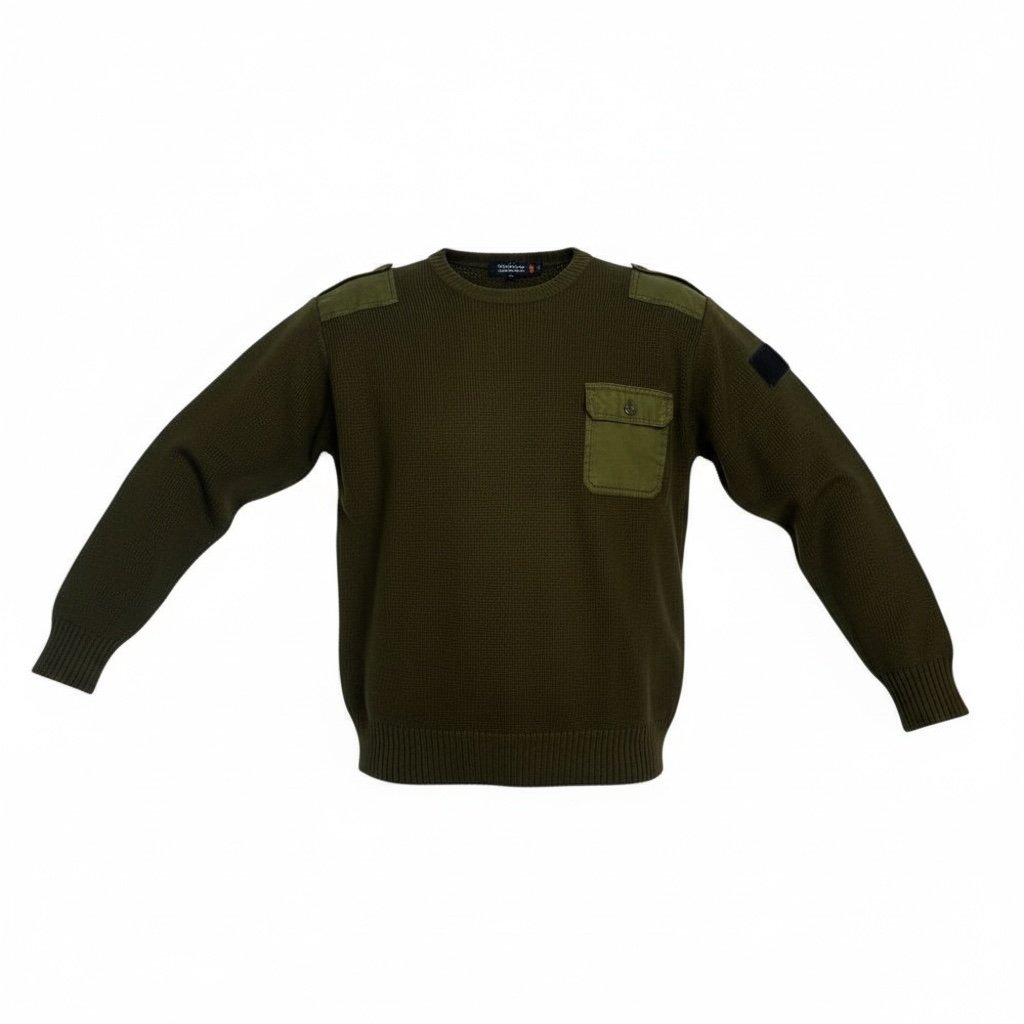 is designed as a durable and practical garment for everyday wear. It features reinforced elbows and shoulders for increased durability, shoulder panels with hook-and-loop fastening, and a chest pocket also secured with hook-and-loop closure. The sleeves and bottom hem are finished with knitted cuffs, and the sweater has a simple V-neck cut. This is an original military-used item, meaning each piece may vary in condition and appearance.