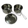 The Esus stainless steel mess kit – 2 × bowls + 1 × lid is a classic two-piece outdoor mess kit consisting of two bowls and one lid, which can also be used as a pan or smaller container. It is made of high-quality CrNi 18/10 stainless steel, which makes it resistant to corrosion and mechanical damage and very easy to clean. The larger bowl has a volume of approximately 1.25 liters, and the smaller lid has a volume of approximately 0.3 liters, allowing for variable use according to current needs. The folding handle makes it easy to handle over an open fire or stove, and the compact design ensures easy storage in a backpack or equipment.