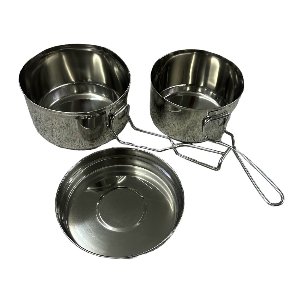 Introducing a stainless steel mess kit, the set includes two pots with diameters of 13 cm and 14.4 cm and one lid compatible with the smaller pot. The set is made of high-quality stainless steel, ensuring high durability and long life. It is a classic CZ military mess kit shape but in a high-quality modern design.