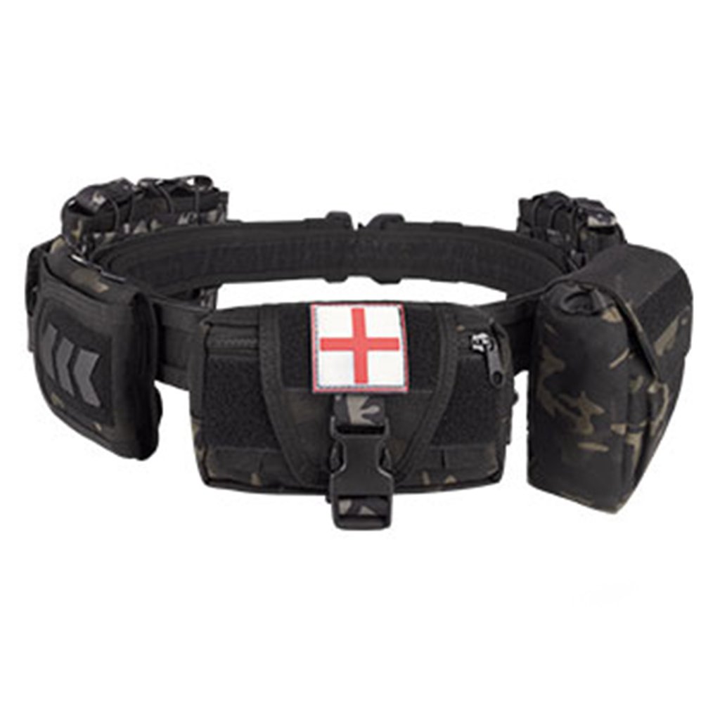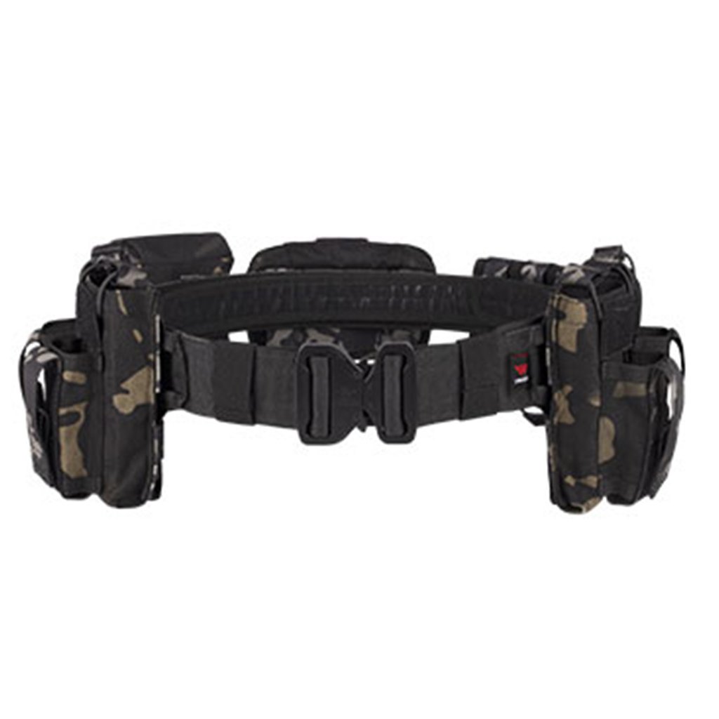 Fully equipped tactical belt setup in Black Multicam, including padded support belt, MOLLE webbing and 5 removable pouches, ready for operational use.