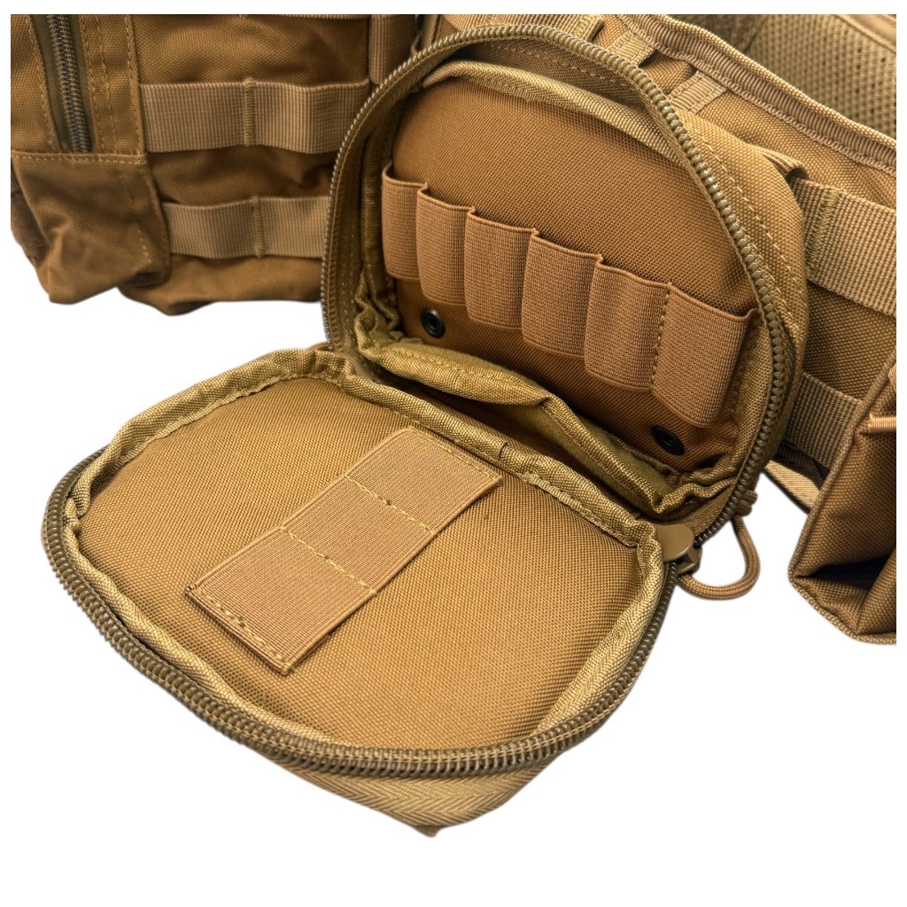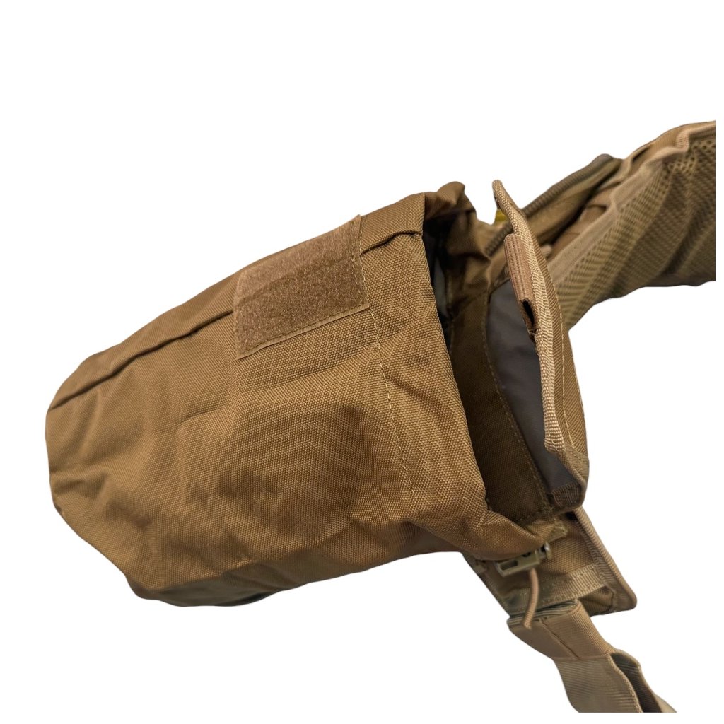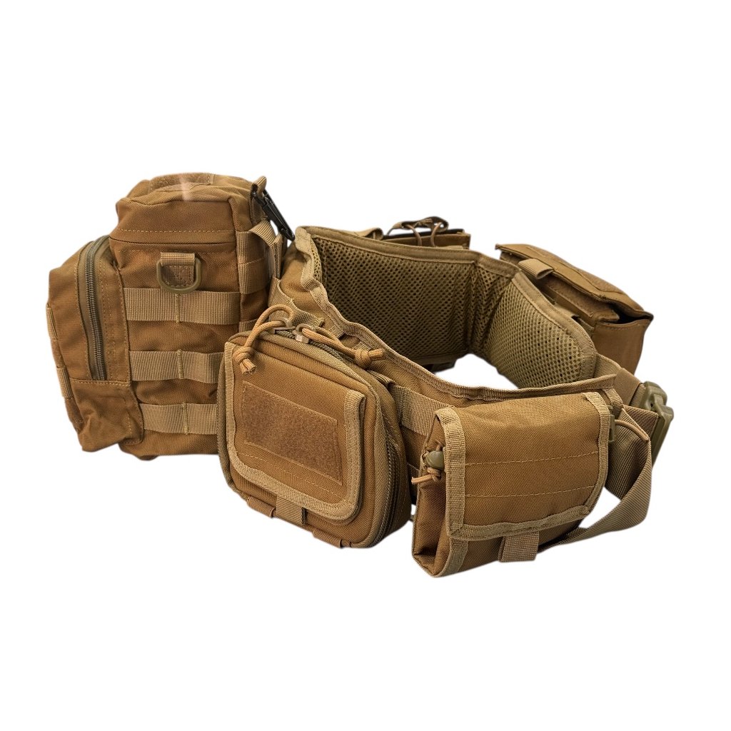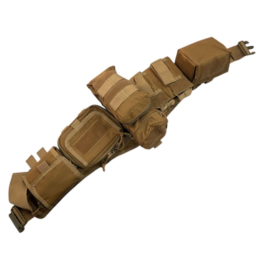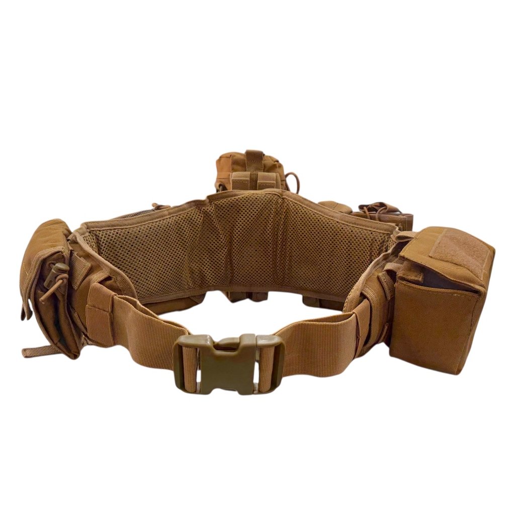 Fully equipped MOLLE tactical belt in coyote color, fitted with multiple pouches and ready for field deployment.