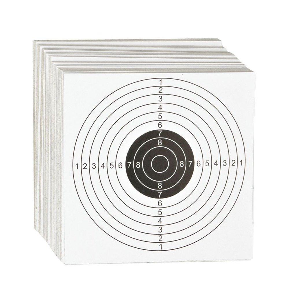 Pack of 100 paper targets measuring 14 × 14 cm from ASG. Ideal for accuracy training and hop-up adjustment.