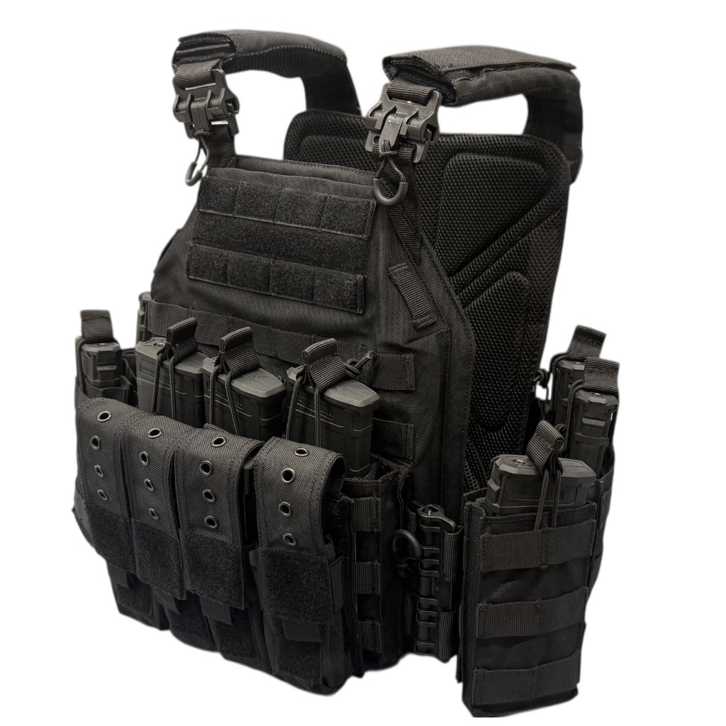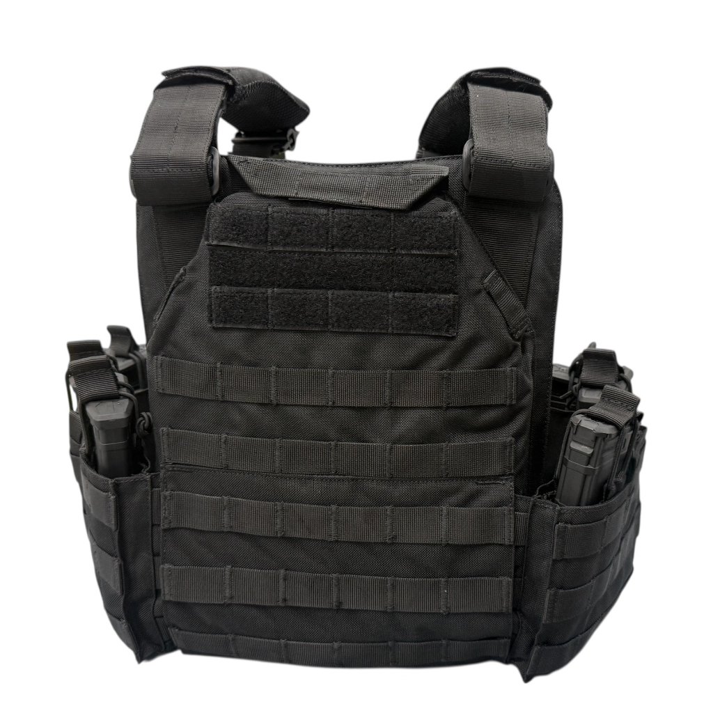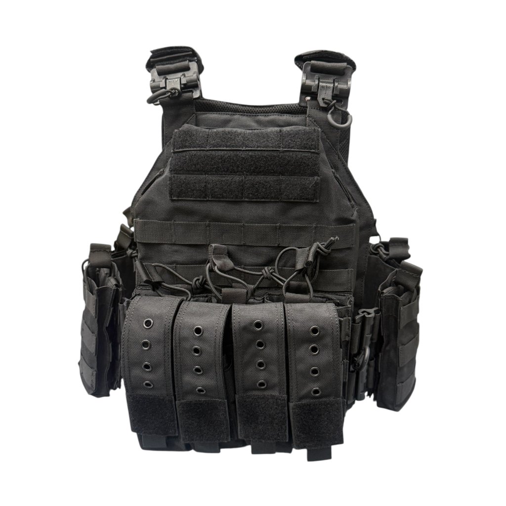 YAKEDA VT-8300-2 Plate Carrier in black is a durable nylon 1000D tactical vest with an interchangeable front panel, space for up to 9 M4/AK magazines, 4 grenades or gear, and quick-release buckles for fast deployment.