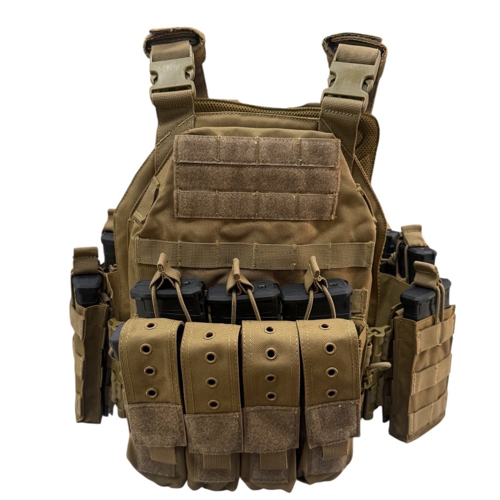 The vest provides generous adjustability at the waist and shoulder straps, ensuring a stable and comfortable fit even during extended use. Integrated pouches accommodate up to 9 M4/AK magazines, while additional pockets can hold up to 4 grenades or other essential equipment.