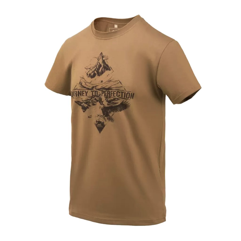 Klasické bavlněné tričko od značky Helikon-Tex s regular střihem. Tento tradiční střih vychází z historického spodního prádla a popularitu získal zejména po druhé světové válce díky ikonickým filmovým hercům. Tričko Mountain Stream patří do produktové řady Urban a je vyrobeno ze 100% bavlny s gramáží 170 g/m², což zajišťuje pohodlí a prodyšnost. Model „Journey To Perfection“ odkazuje na outdoorové aktivity a filozofii značky Helikon-Tex.
