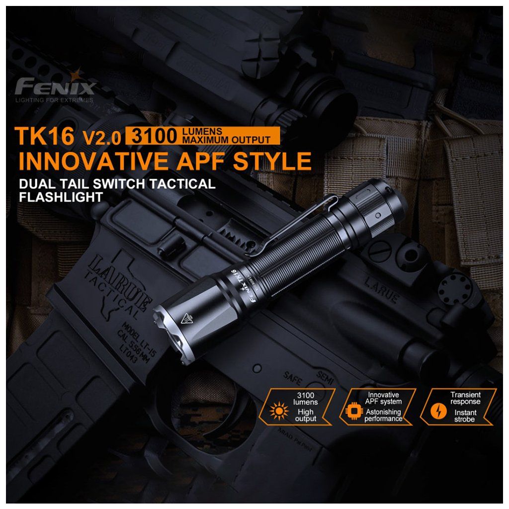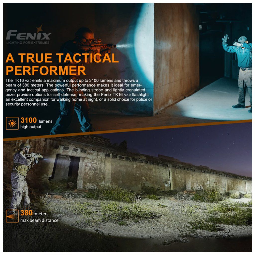 Nabíjecí Taktická LED svítilna USB-C TK16 V2.0 - Fenix je výkonná svítilna s maximálním světelným tokem 3100 lumenů a dosvitem přes 380 metrů, určená pro taktické použití, outdoor a profesionální nasazení.