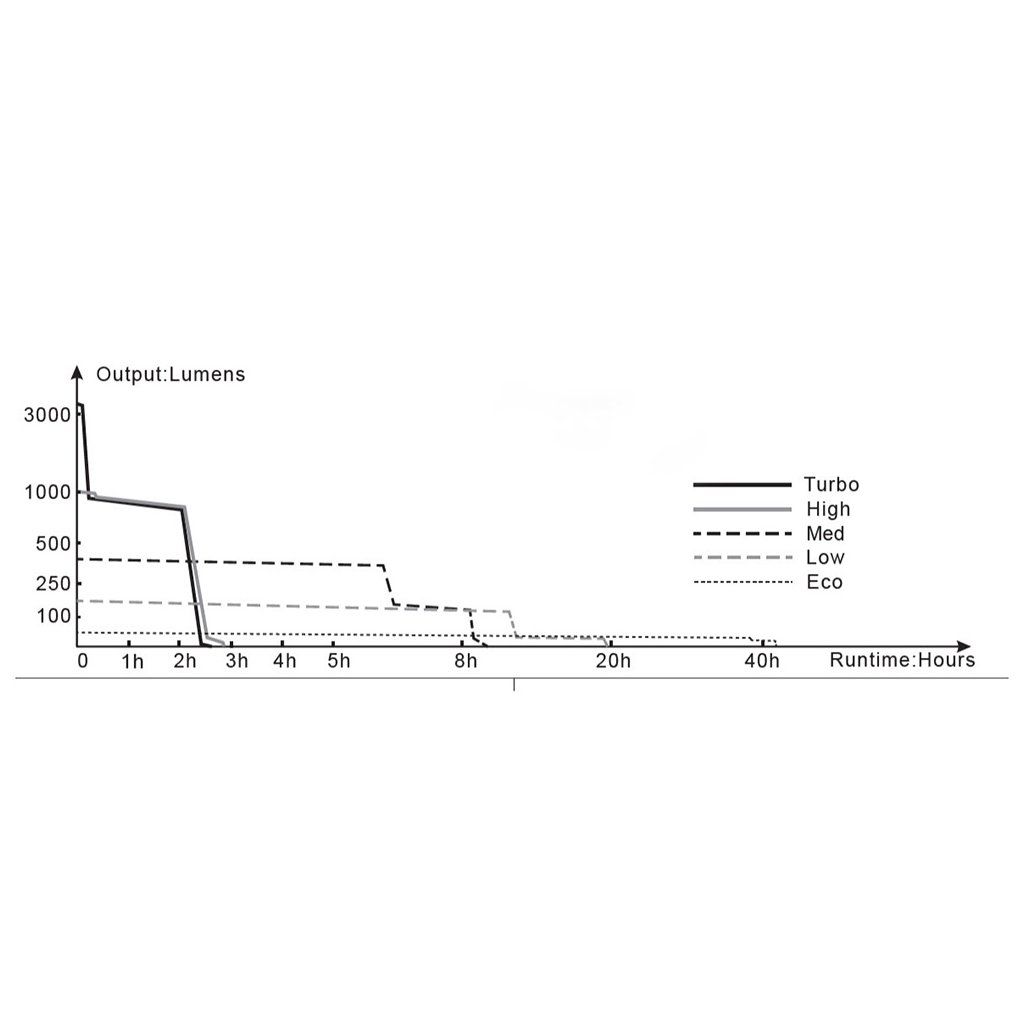 – režimy svícení: 3100 lm (2,66 h), 1000 lm (2,8 h), 350 lm (8,3 h), 150 lm (19,2 h), 30 lm (43,3 h), stroboskop