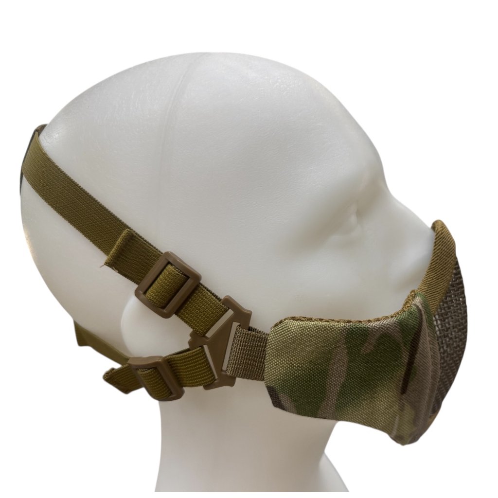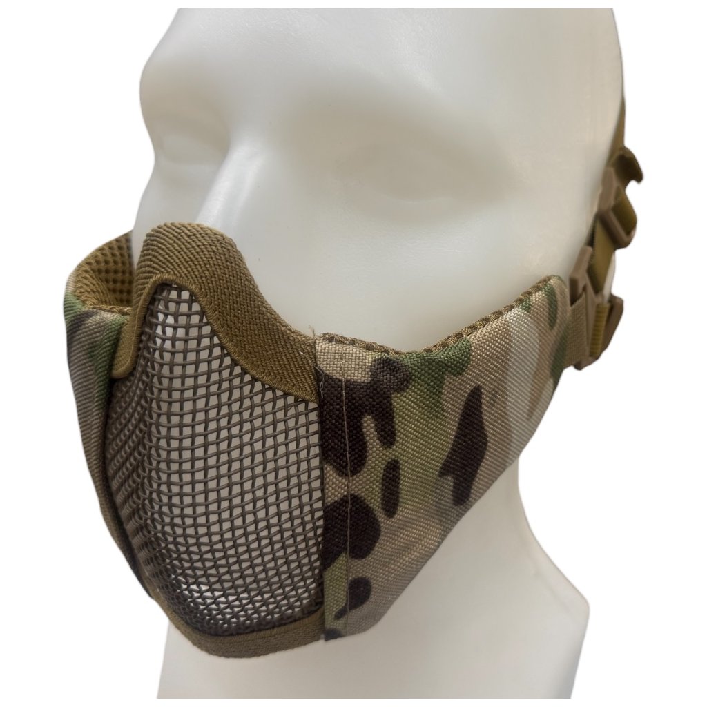 Maska je vyrobena z kombinace kvalitního materiálu 1000D na lícnicích a pevné ocelové mřížky v centrální části, která účinně tlumí zásahy kuličkami. Vnitřní strana lícnic je měkce polstrovaná pro pohodlné nošení i při delších hrách. Díky nastavitelným popruhům maska dobře sedí na různých typech obličeje.