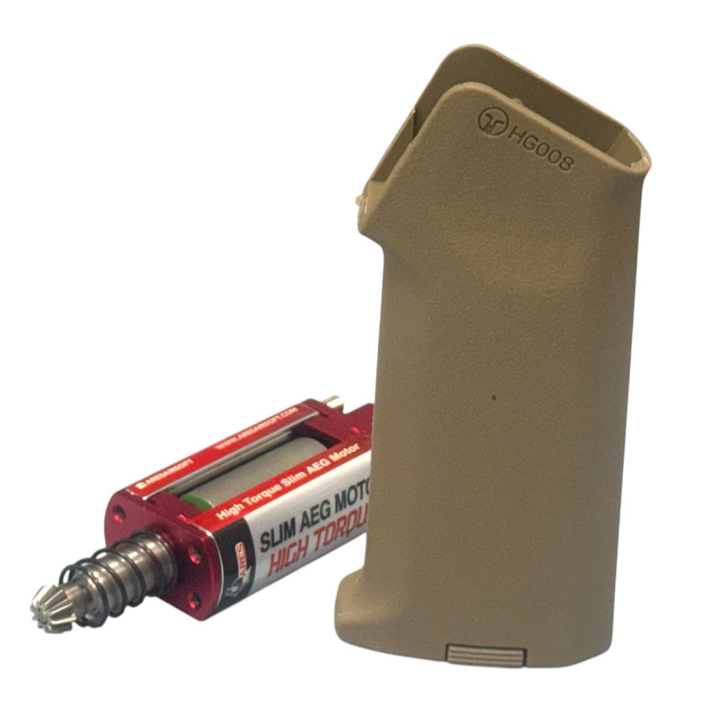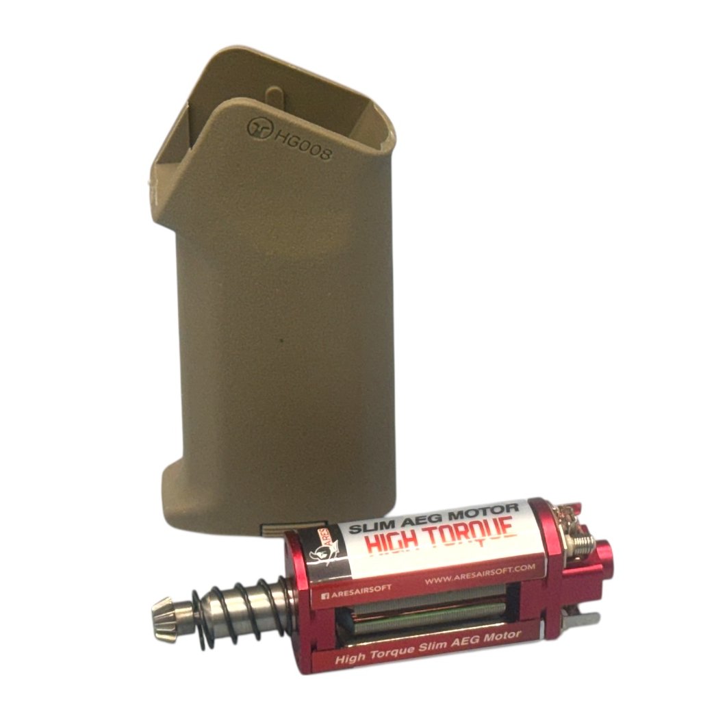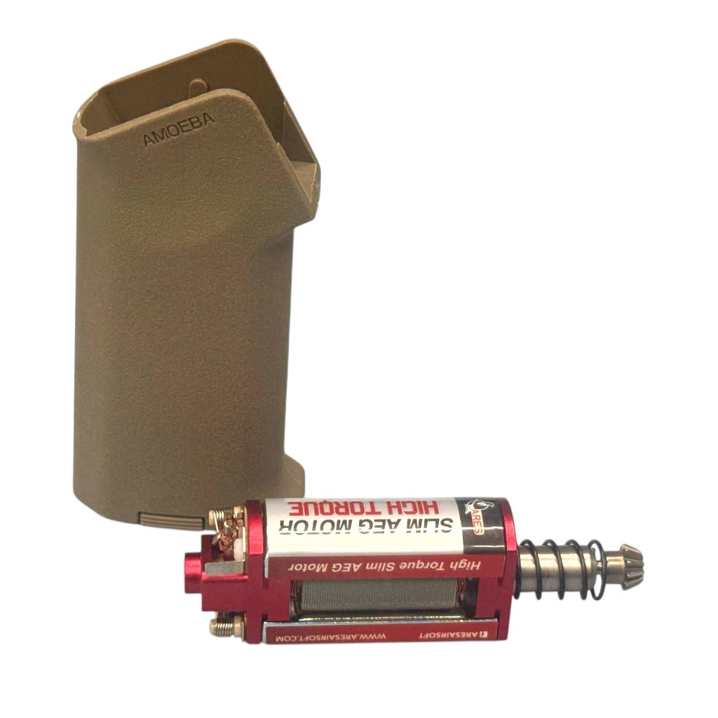 Pažbička Amoeba Slim Pistol Grip + Super High Torque Slim AEG Motor (coyote) - ARES - Tenká a ergonomická pažbička s realistickým vzhledem, vybavená vysokootáčkovým motorem ARES. Ideální volba pro hráče, kteří chtějí kombinovat výkon, komfort a realistický pocit ze střelby.