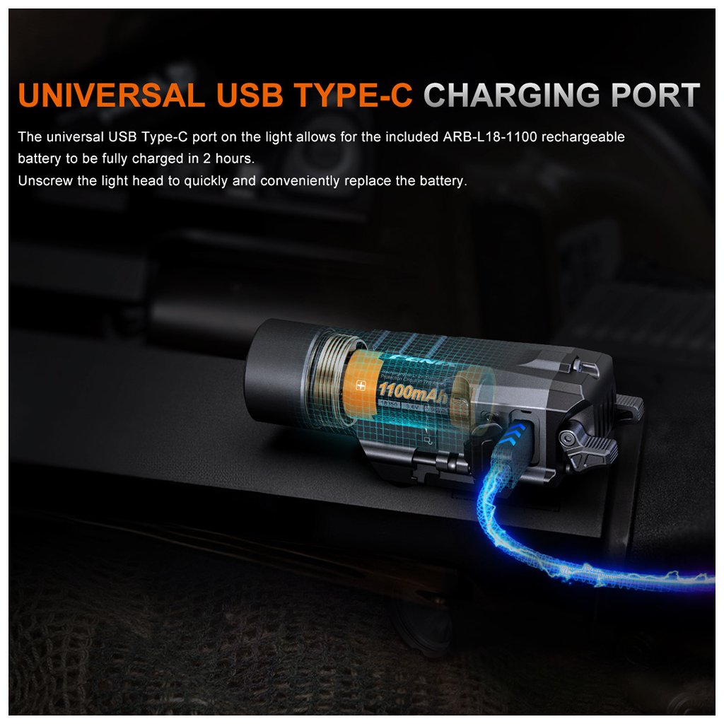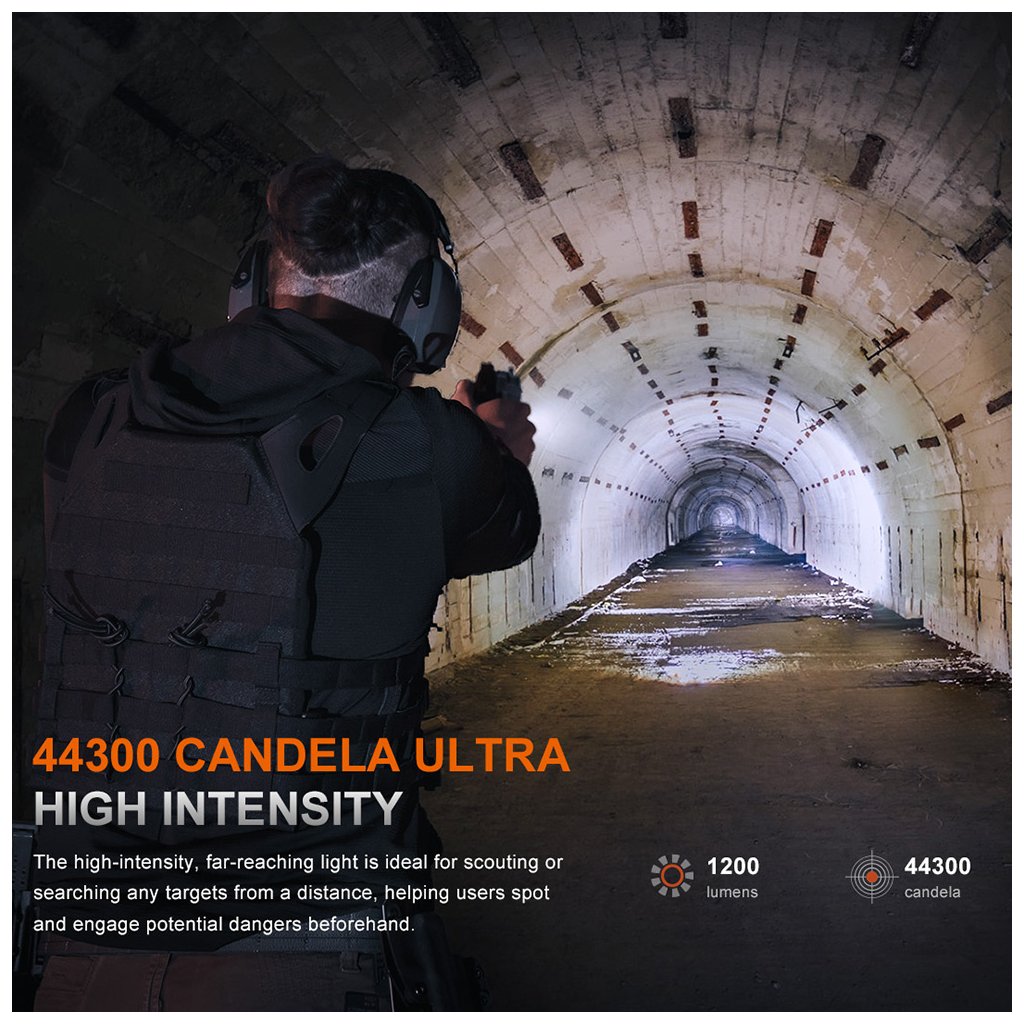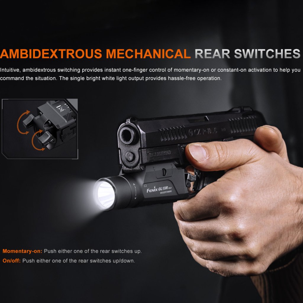 Pistolová nabíjecí svítilna Fenix GL19R v2.0 - Fenix je výkonná pistolová taktická svítilna s výkonem až 1200 lumenů, USB-C nabíjením a montáží na lišty Picatinny nebo GLOCK.