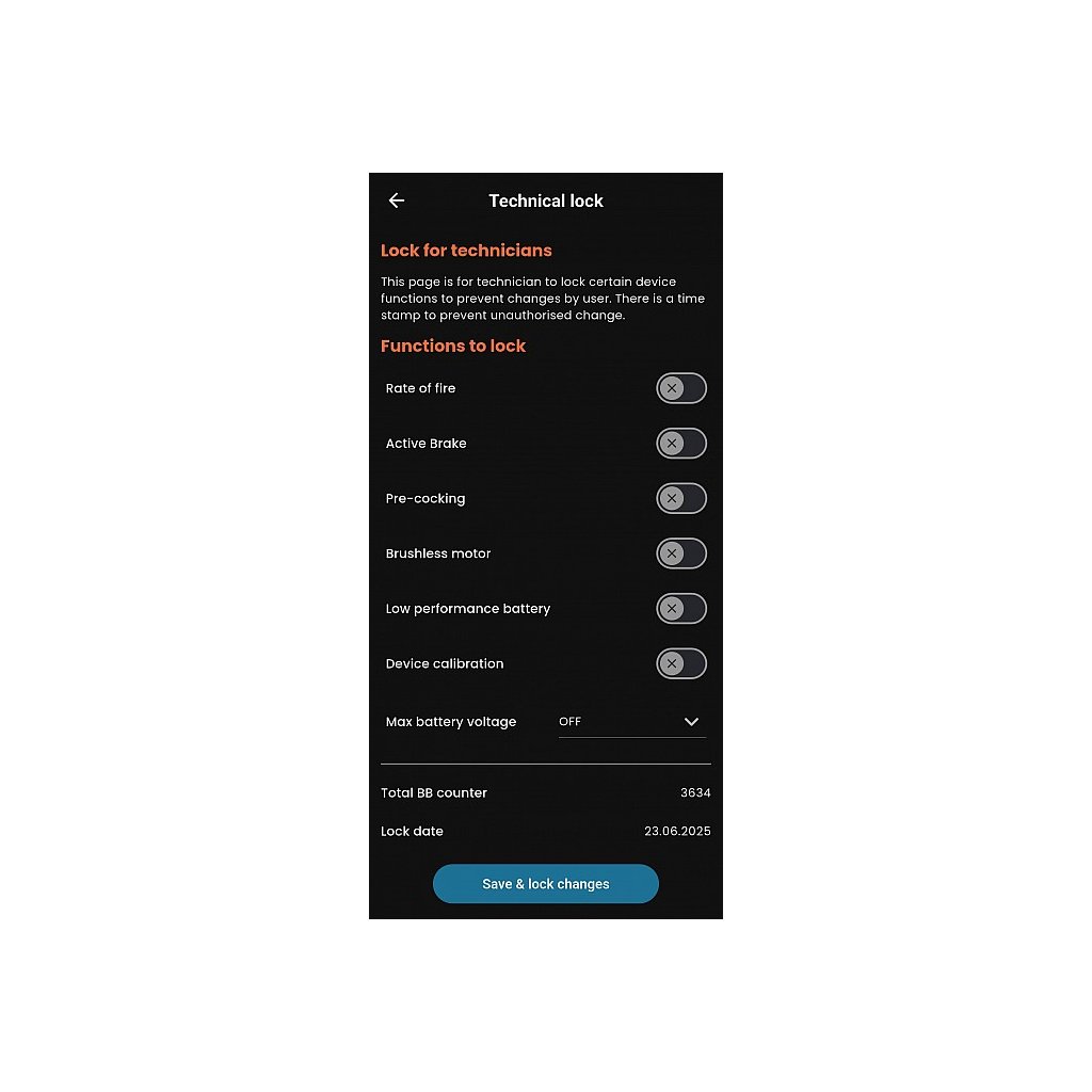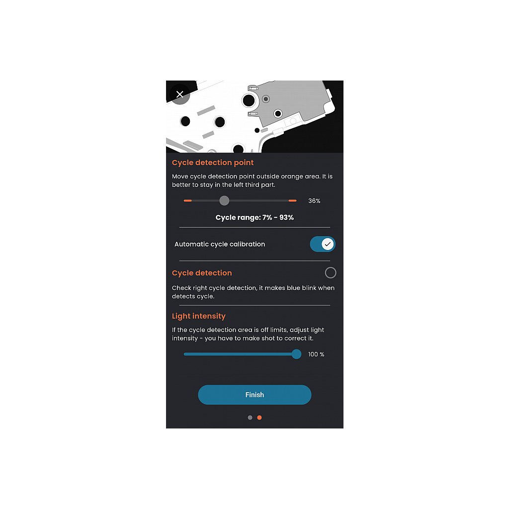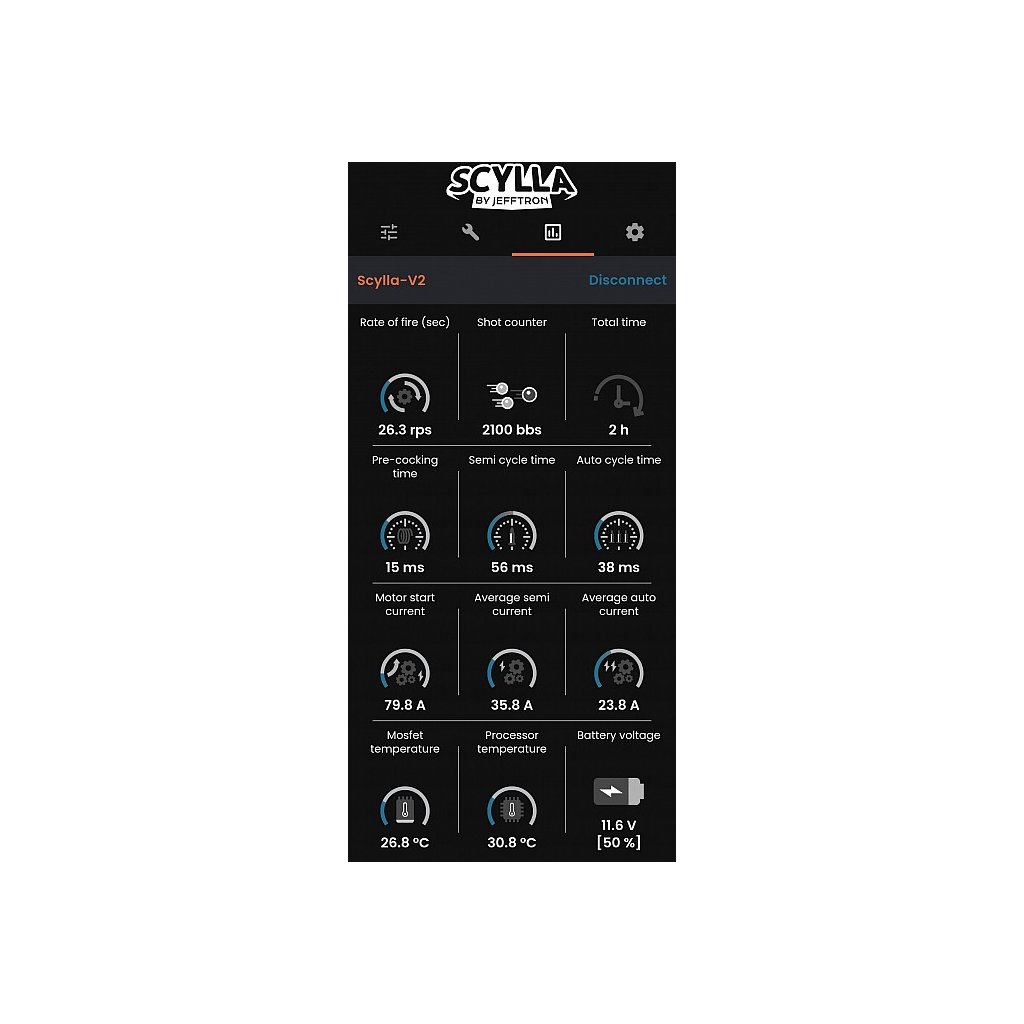 - Statistiky a monitoring v aplikaci: kadence, počet výstřelů, teplota MOSFETu, proud, napětí baterie a další.