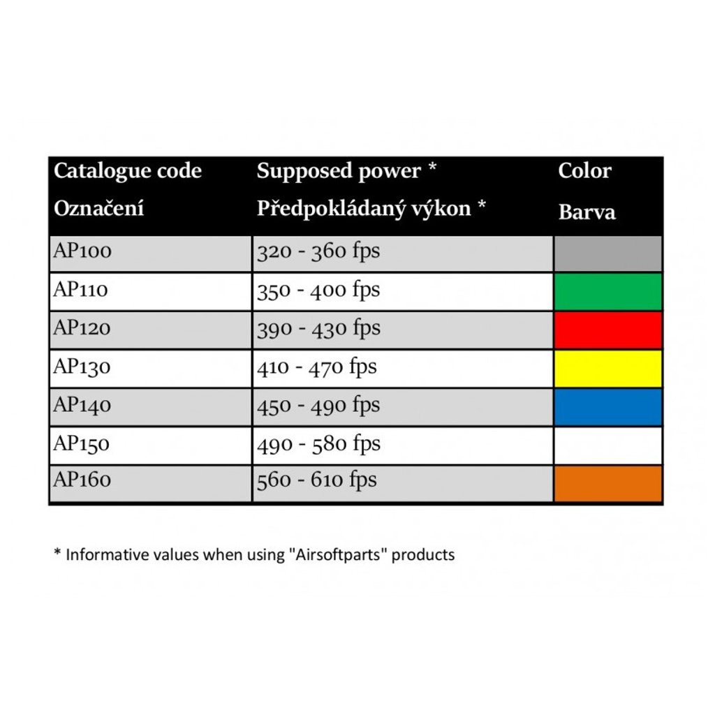 Pružina M150 od AirsoftParts je vyrobena z vysoce kvalitního ventilového drátu z Německa, zajišťující konstantní výkon a progresivní tuhost díky tepelnému zpracování a proměnnému stoupání. Kompatibilní s mechaboxy v.2, v.3, v.6 a v.7, s výjimkou speciálních modelů jako PSG1, SR25 a L85. Povrchová úprava černěním a barevně označené konce pro snadnou identifikaci.