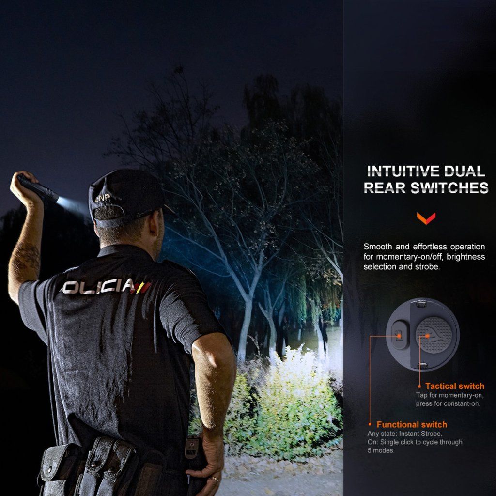 Ovládání je řešeno duálním taktickým spínačem na konci svítilny, který umožňuje okamžité zapnutí nebo rychlou aktivaci stroboskopu. Robustní konstrukce z leteckého hliníku A6061-T6 s povrchovou úpravou Type III hard anodized zajišťuje vysokou odolnost proti nárazům, vodě i prachu. Hlava svítilny je vybavena úderným ráfkem, který umožňuje rozbití skla v krizových situacích. Konstrukce je vhodná i pro montáž na dlouhé zbraně.