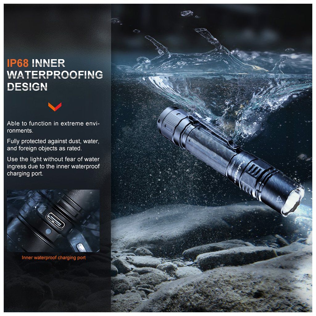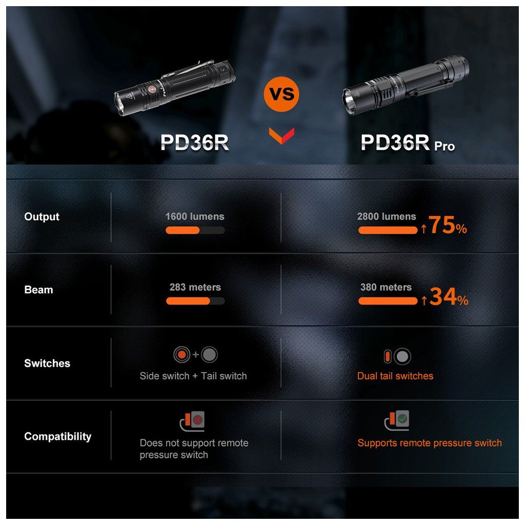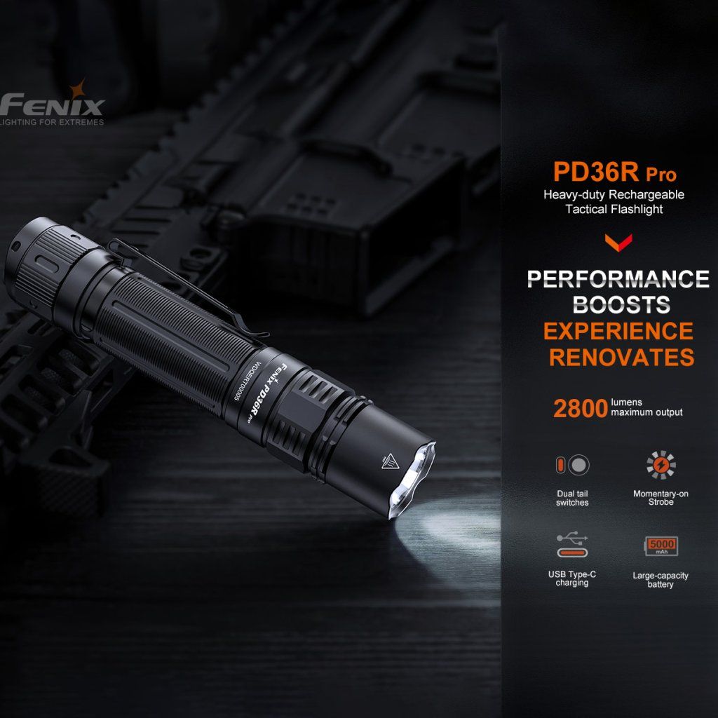 Fenix PD36R PRO je výkonná taktická svítilna vybavená LED Luminus SFT-70 s životností 50 000 hodin. Nabízí maximální světelný tok 2800 lumenů a dosvit až 380 metrů. Svítilna disponuje šesti režimy výkonu včetně stroboskopu a je napájena Li-ion akumulátorem typu 21700 s kapacitou 5000 mAh, který se nabíjí přímo ve svítilně prostřednictvím USB-C konektoru. Digitální elektronika zajišťuje stabilní výkon a inteligentní ochrana proti přehřátí chrání svítilnu při dlouhodobém provozu.