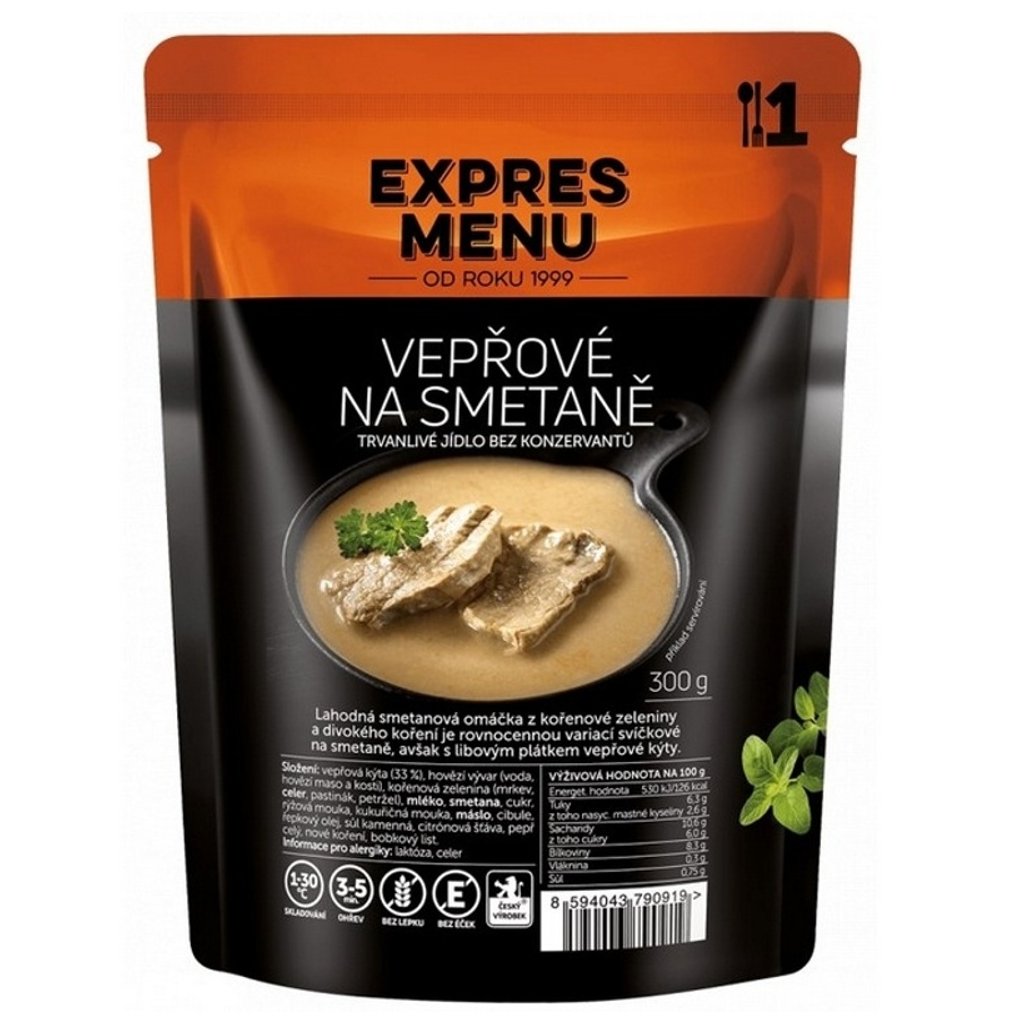 Vepřové na smetaně (1 porce 300g) - Expres menu – je lahodné jídlo, které poskytuje rovnocennou alternativu klasické svíčkové na smetaně. Je to smetanová omáčka s kořenovou zeleninou a divokým kořením s plátkem libové vepřové kýty (33 %).